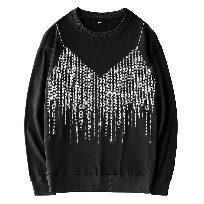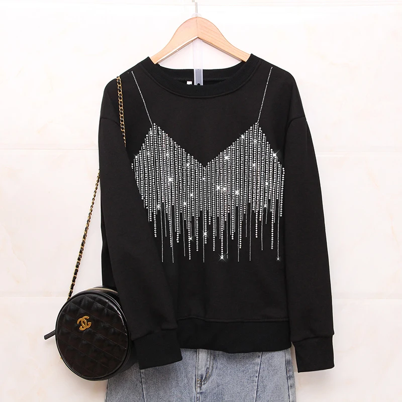 Осенние новые черные модные свободные кофты для творчества, женские творческие слинг, с рисунком горячих бриллиантов, повседневные женские топы с круглым вырезом, пуловеры