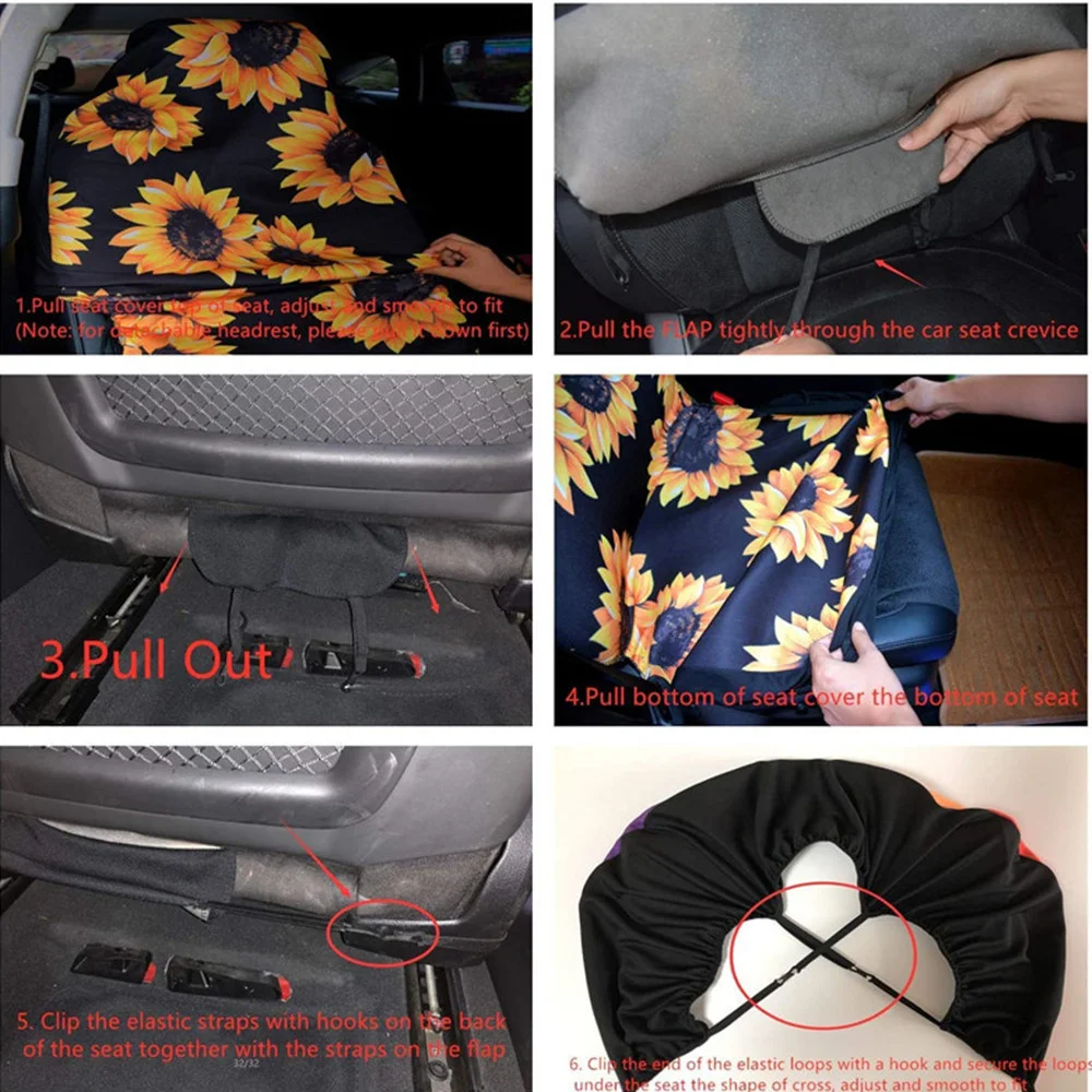 Простота установки и очистки: эластичный ремешок с крючками на нижней части чехлов для сидений, установка может быть выполнена в любом месте, следуя инструкциям. Является доступной альтернативой пользовательским чехлам для сидений. Можно стирать, не выцветает.