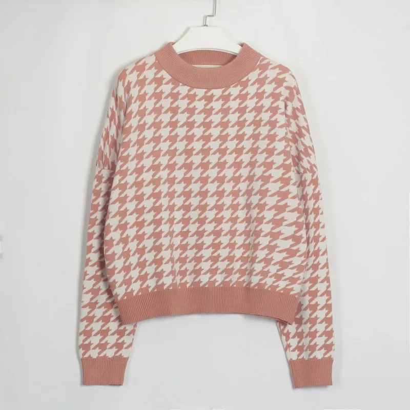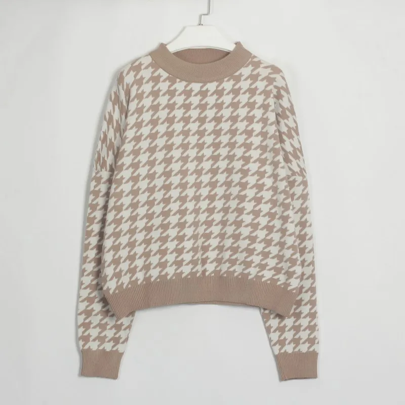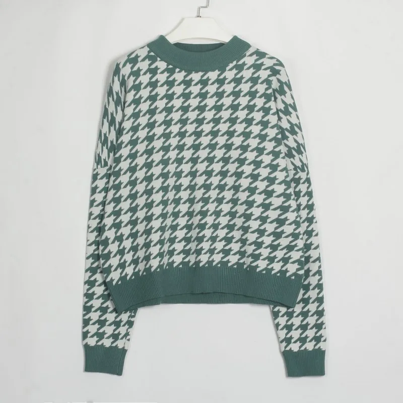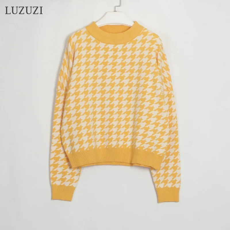 LUZUZI, осенний, зимний, модный свитер, женский, пуловер, Повседневный, круглый ворот, гусиная лапка, длинный рукав, вязанные свитера, женские, Осенние Джемперы, укороченный свитер