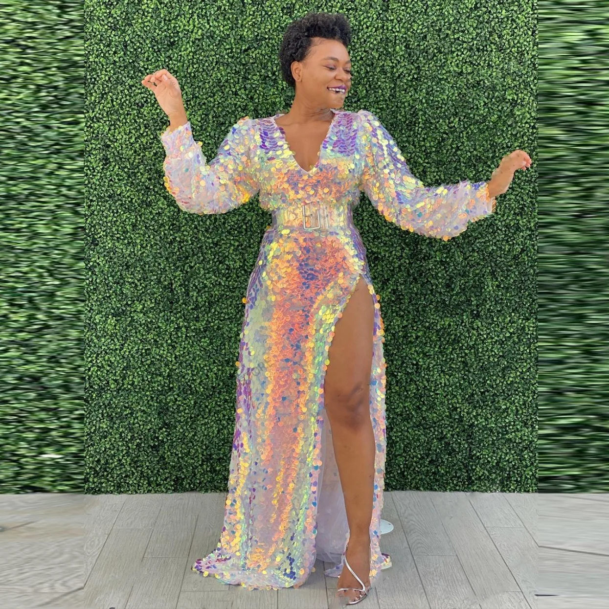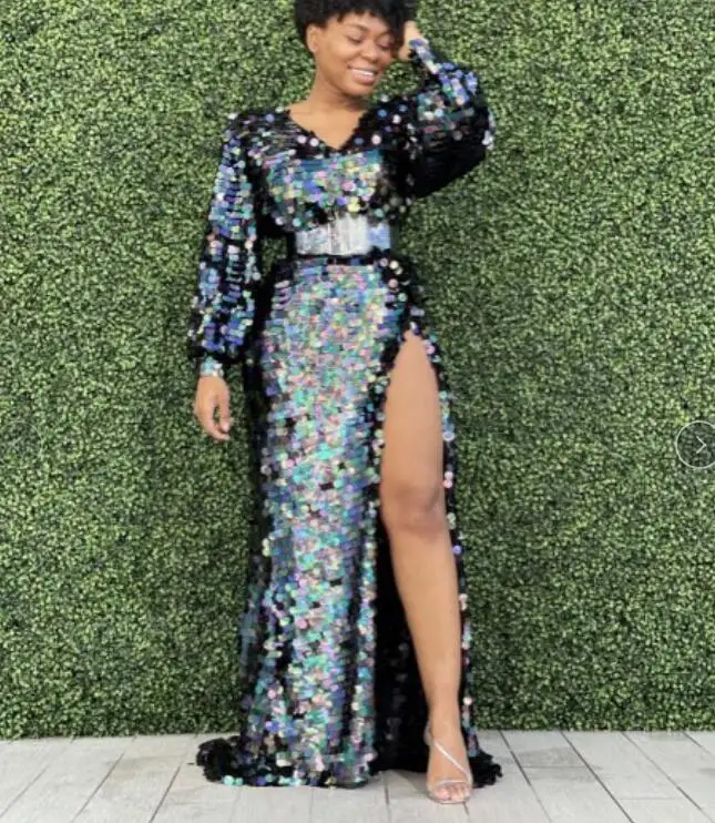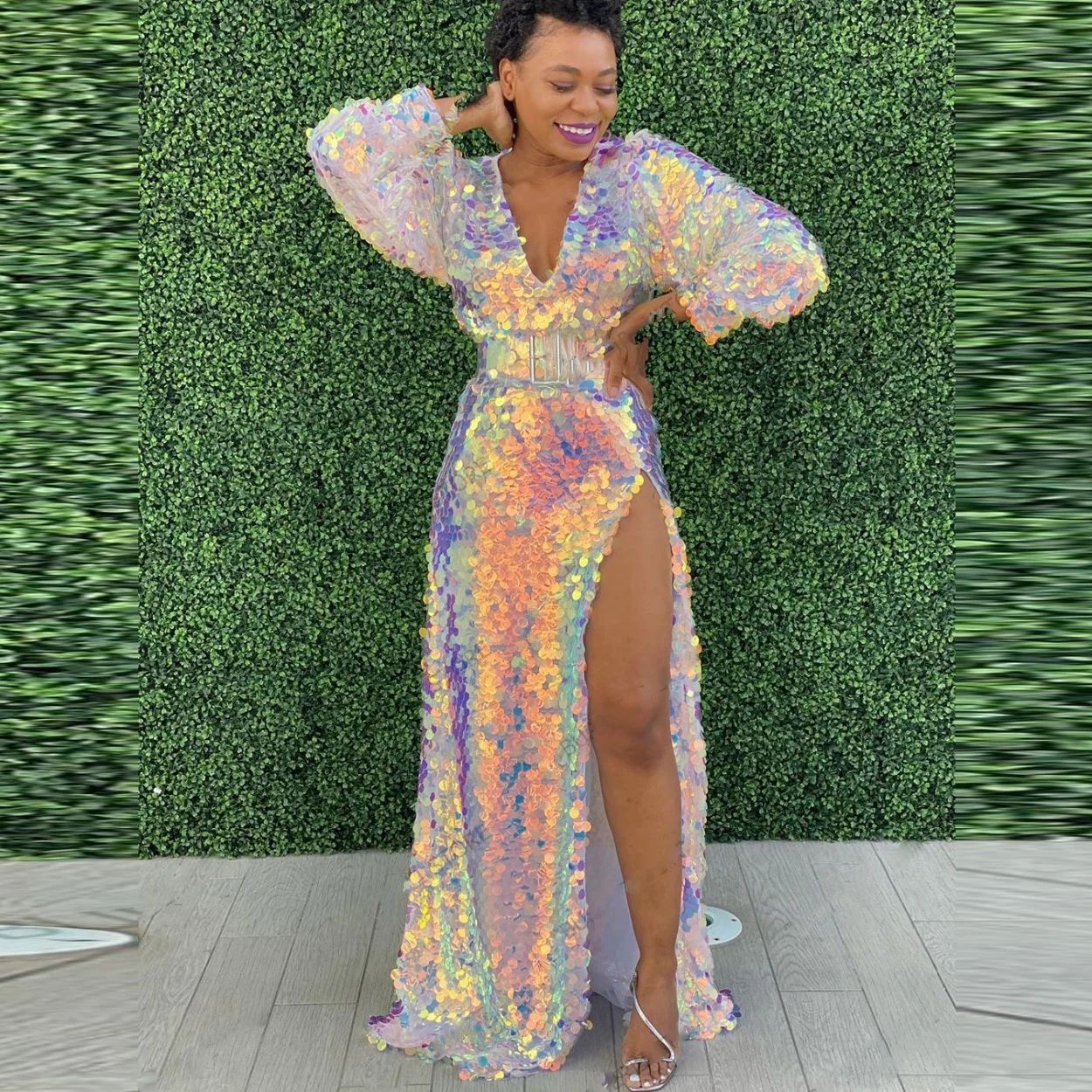 Женское вечернее платье с высоким разрезом, длинным рукавом и блестками