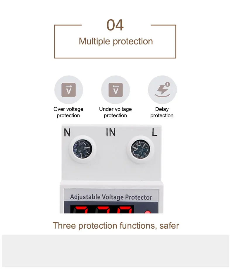 Его основная особенность заключается в том, что когда цепь имеет перенапряжение или Низковольтное напряжение, проблемы с током, продукт может немедленно отключить источник питания для защиты электрооборудования от повреждения, кроме того, протектор может автоматически включать источник питания, когда напряжение цепи возвращается к нормальному.