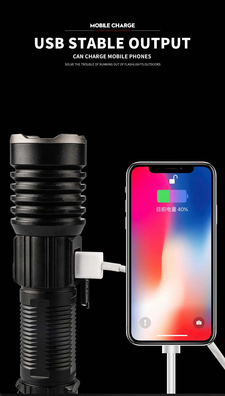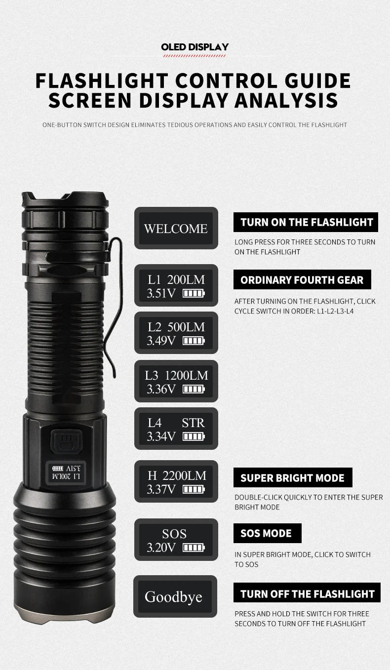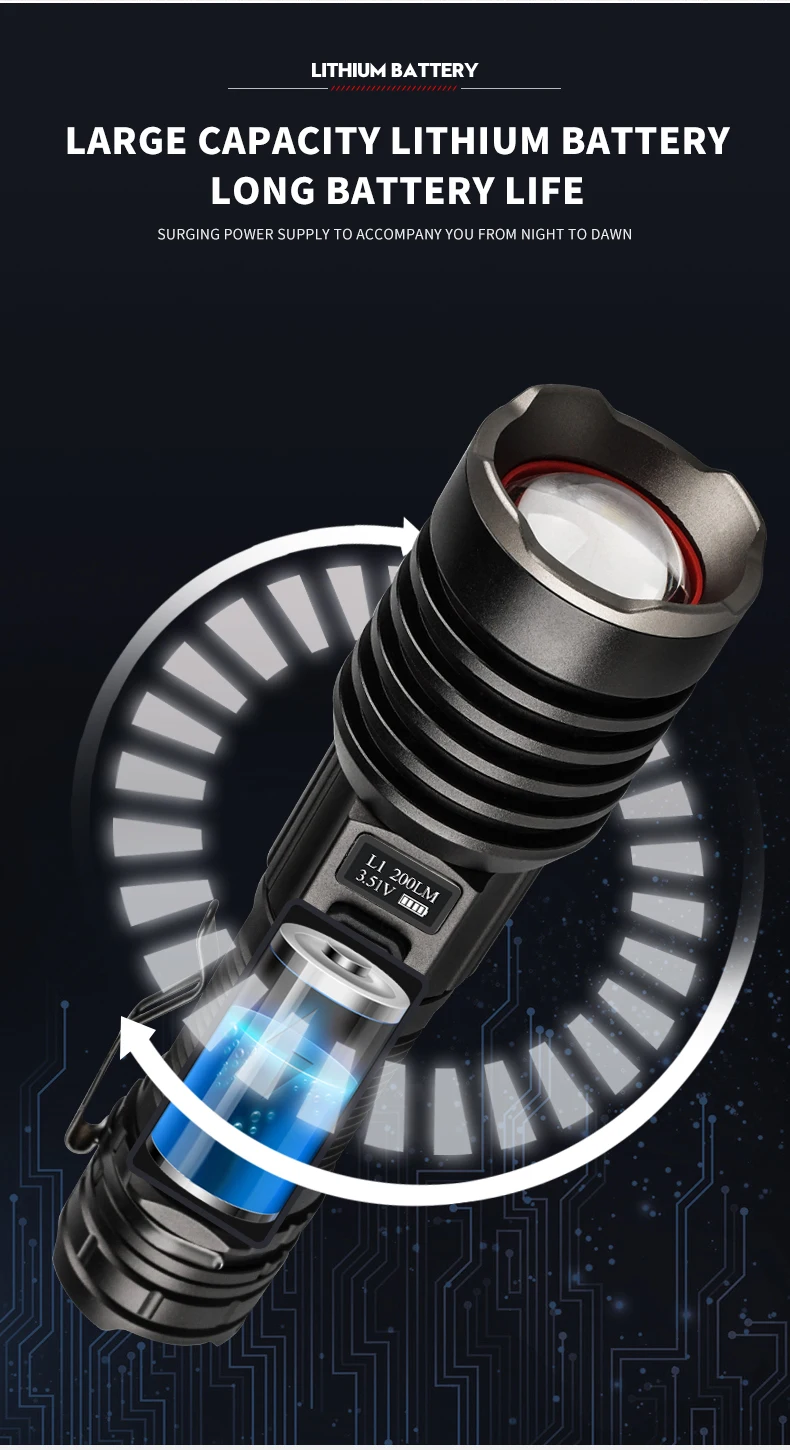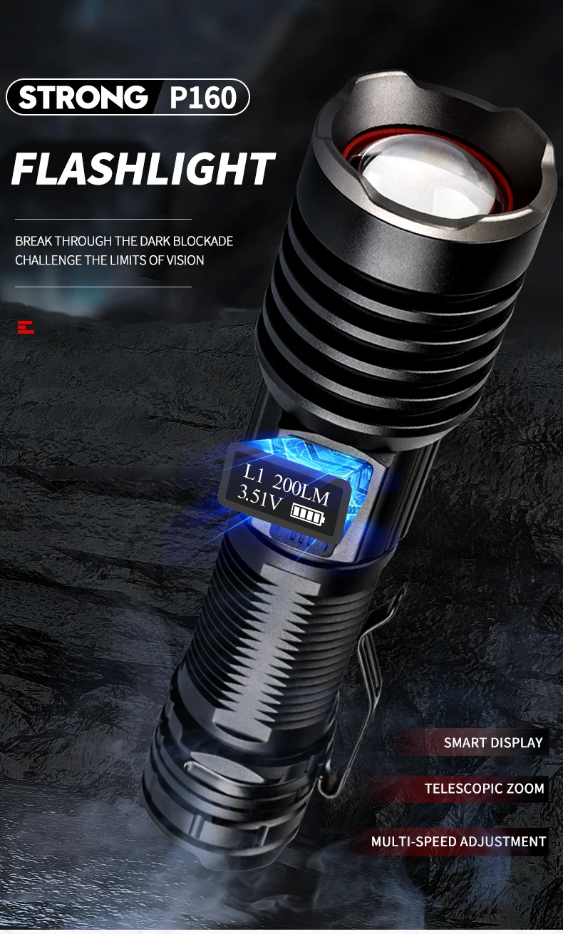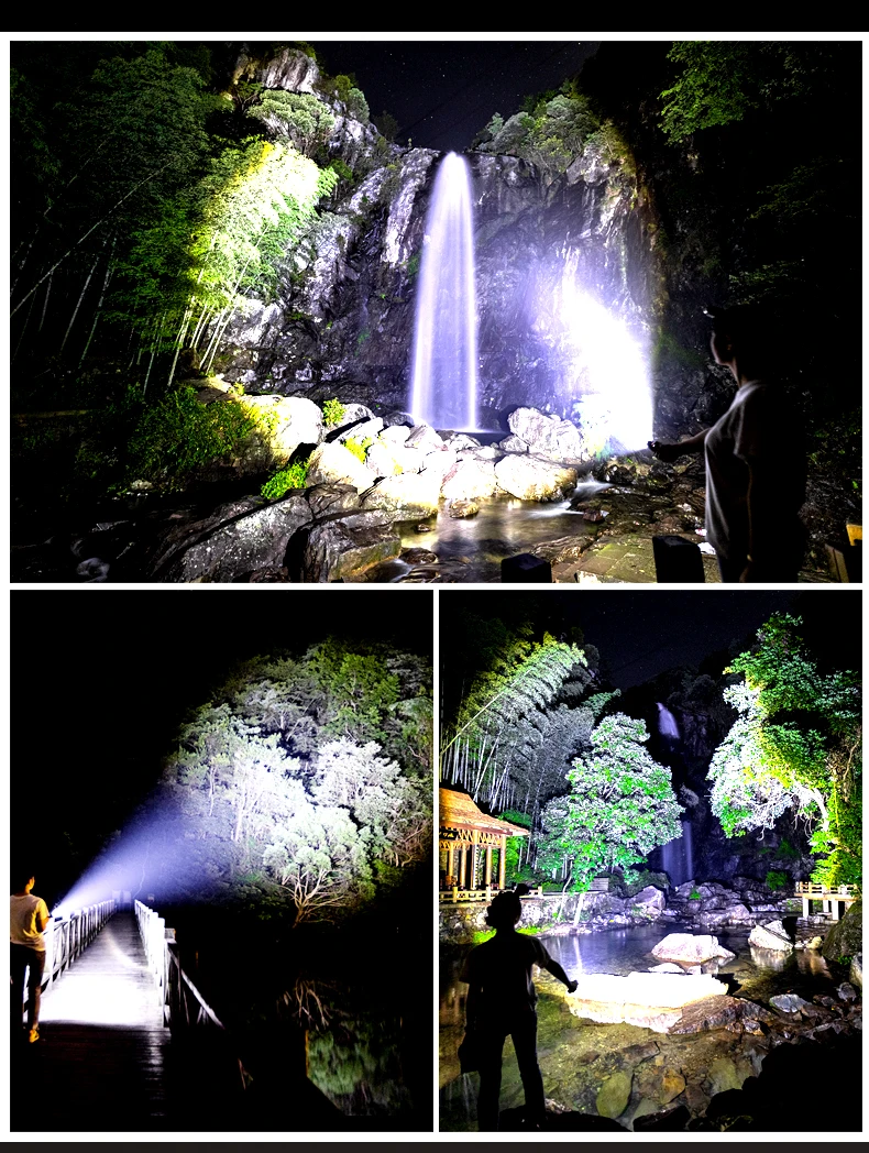 * С использованием 16 лампочек P160 Максимальный световой поток достигает 6800, максимальное расстояние освещения превышает 500 метров, а яркость превышает яркость автомобильных фар. Это ваш лучший выбор для приключений на открытом воздухе, кемпинга и пеших прогулок.* С умным ЖК-дисплеем, мощностью дисплея, яркостью дисплея. Когда батарея низкая, ее необходимо заряжать вовремя, чтобы избежать повреждения батареи.* Поверхность жесткая анодированная, износостойкая, анти-капля и антикоррозийная. На хвосте есть молоток безопасности, который может легко сломать стекло.
