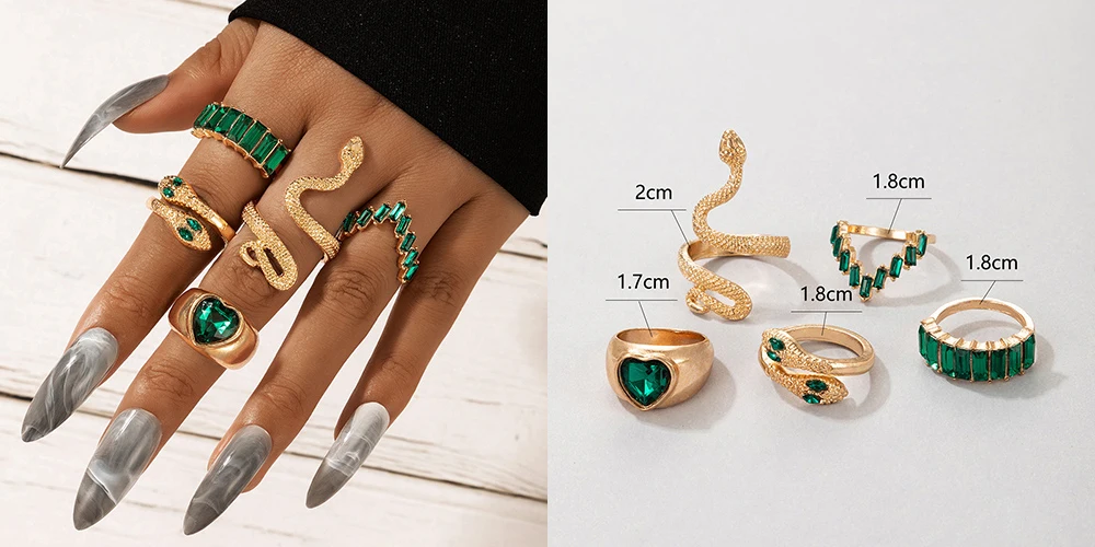 5 шт.компл. модное женское кольцо в виде сердца с зелеными кристаллами