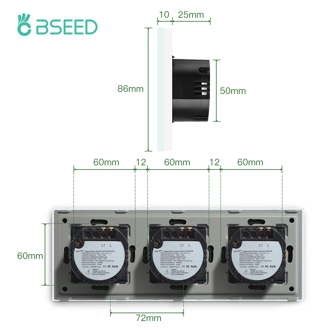 Сенсорный переключатель Bseed, 3 комплекта, 2-сторонний сенсорный переключатель европейского стандарта, цвет белый, черный, золотой, со стеклянной панелью, товары для дома