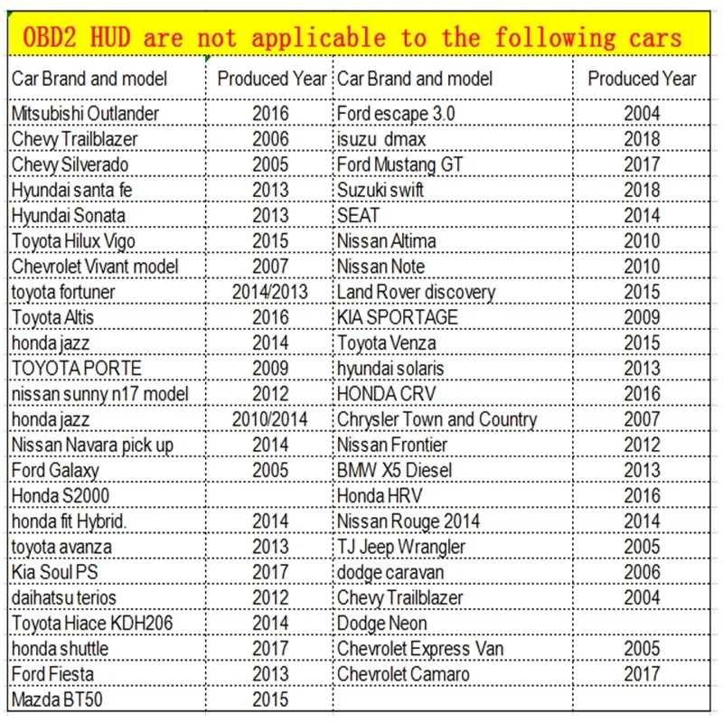 Несовместимость:Не дляГибридные и дизельные автомобили, пикапы, RVs, автомобили с модифицированными автомобильными компьютерами,Не дляVolvo, Швейцария,Не для CHrysler Group, все брендовые модели подНе дляFiat Group.