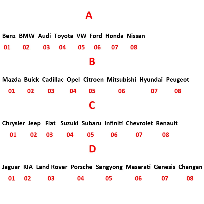 (Например, если вы хотите логотип для BMW, пожалуйста, выберите"A"И"02",