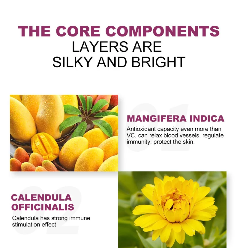 Слои шелковистые и яркие1.MANGIFERA INDICA: антиоксидантная емкость даже болееVC, может расслабить кровеносные сосуды, регулировать иммунитет, защищать кожу.2. OFFICINALIS календулы: Календула имеет сильный эффект иммунной стимуляции3.PERSEA GRATISSIMA: фрукты с высокой питательной ценностью, богатые витаминами, жиром и белком4. Глицерин: блокирует воду и увлажняет, чтобы набрать вес