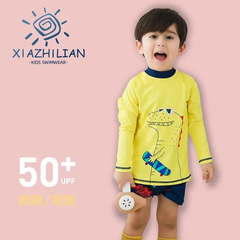 Детский купальный костюм с принтом динозавра, желтый купальник с длинными рукавами UPF50 + УФ купальник для мальчиков, детский купальный костюм
