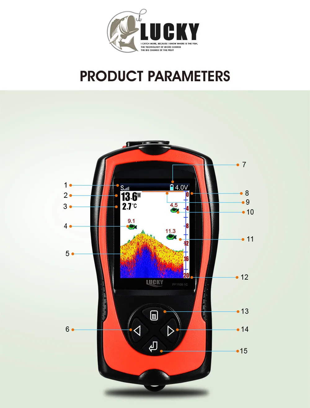 1. Проводной сигнал 2. Глубина воды 3. Температура воды 4. Средний значок с глубиной 5. Нижний контур 6. Левая стрелка 7. Индикатор силы батареи 8. Глубина верхнего предела 9. Вода surface10. Маленькая рыба с значком depth11.big fish с dept12.Depth низкий лимит 13.меню 14. Правильное включение/выключение arrow15.Power