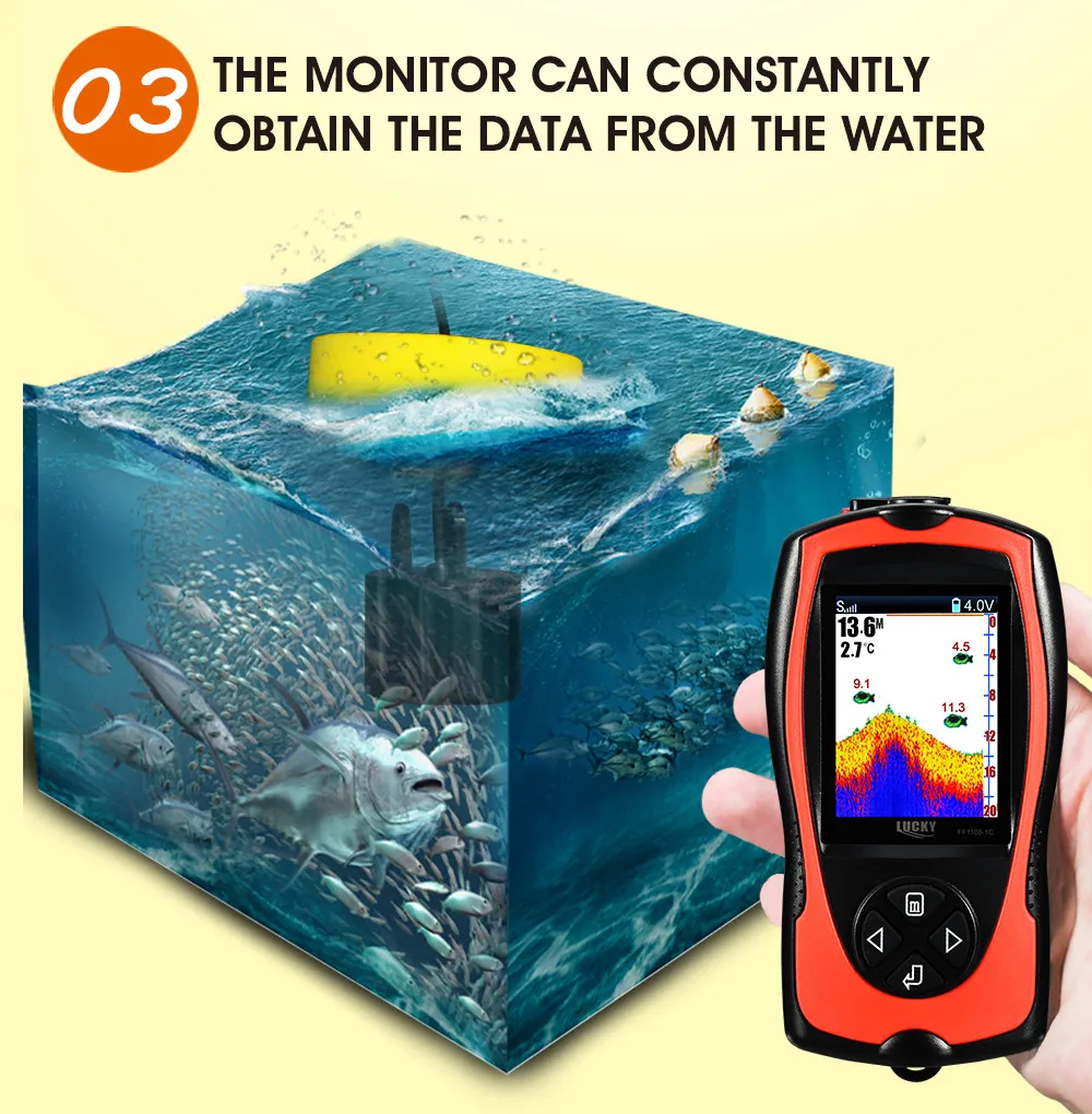 Преобразователь может сканировать и выпускать область воды, а сонар может обнаруживать местоположение рыбы.