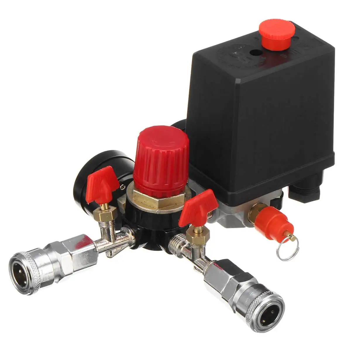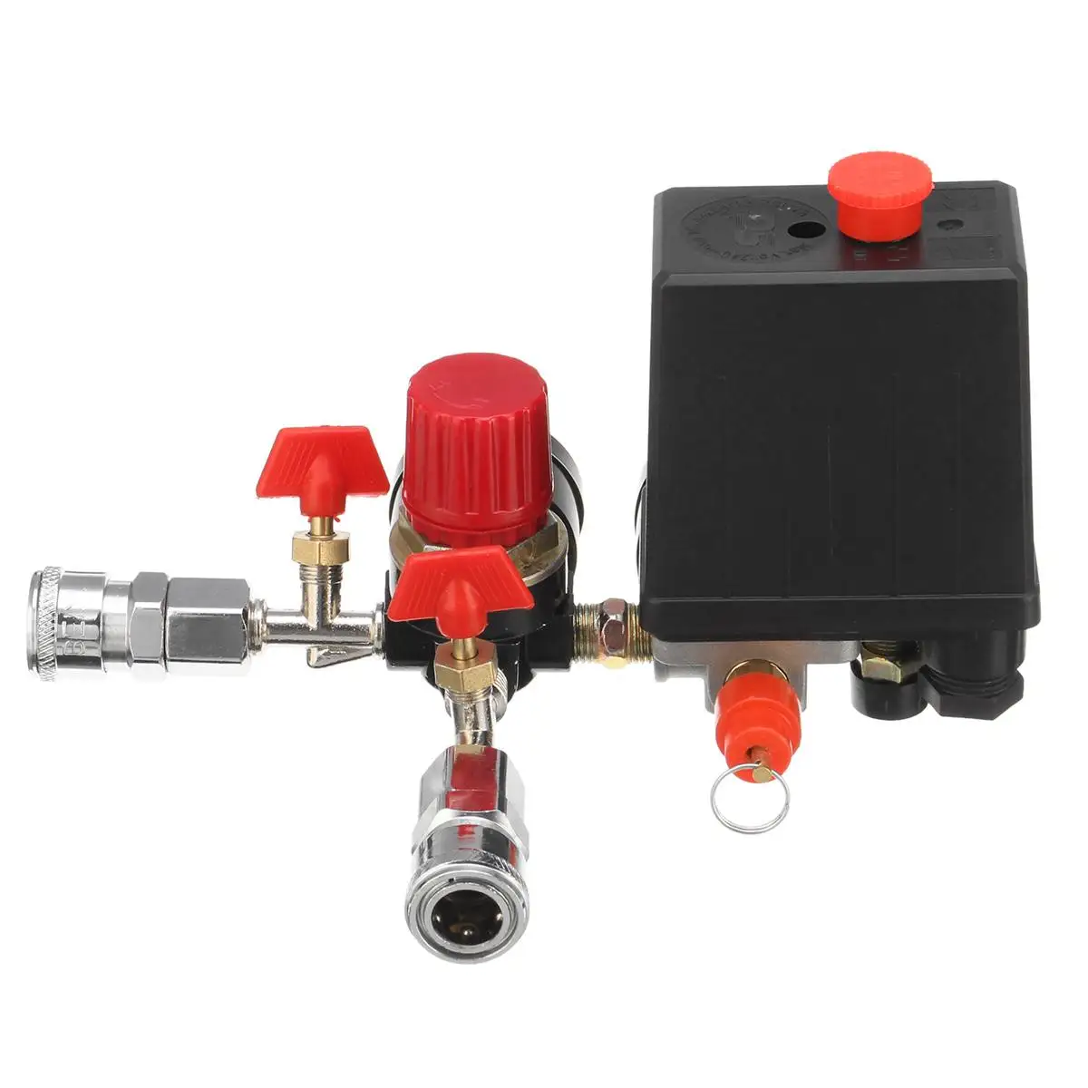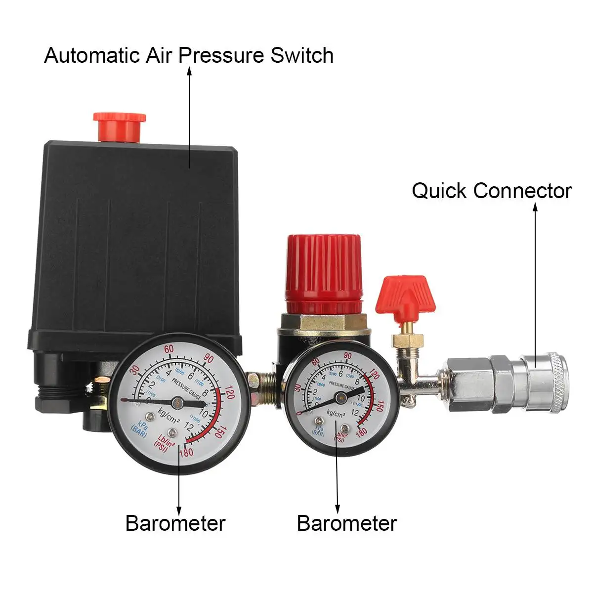 120 PSI переключатель давления для воздушного компрессора регулирующий клапан манометр с быстрым соединителемМаксимальное напряжение: 240 ВМаксимальная номинальная мощность усилителя: 20 AДиапазон контроля переключателя давления: 95 ~ 125 PSIРегулировка регулятора давления: 30 ~ 120 PSIДиаметр наружной резьбы: Приблизительно 21 мм-1/2 "NPT (для воздушного компрессора)Запорные клапаны Диаметр резьбы: 13 мм-1/4 "NPTРазмер (Д * Ш * В): 21x15x12,5 смОсобенности:С 2 быстрыми соединителями.Автоматическое управление, автоматическая загрузка/выгрузка.Есть красная кнопка включения/выключения, удобная конструкция для использования.Давление ниже 90 фунтов на квадратный дюйм, включите компрессор. Давление над 120PSI, выключите компрессор.Посылка включает в себя:1 x переключатель клапана давления воздушного компрессора с быстрым соединителем