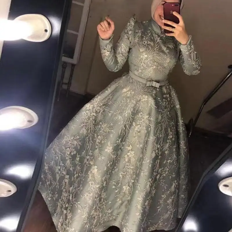 Мусульманские Вечерние платья с длинными рукавами, высоким воротником, поясом-бантом, размера плюс, Африканское официальное длинное платье