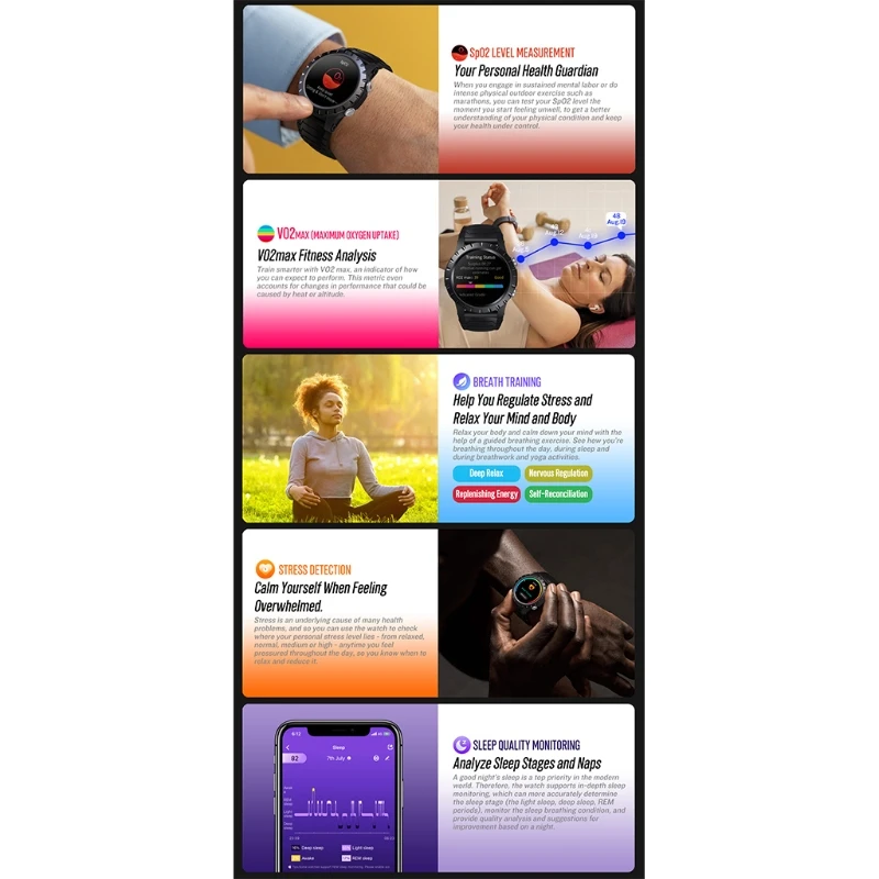 Характеристика:Время/дата, gps-синхронизация времени, будильник, таймер, секундомер, обратный отсчет, пульс на запястье, тренировка дыхания, оценка сна, отслеживание сжигания калорий, компас, умное уведомление, погода, найдите мой телефон, напоминание о мобильном телефоне, шагомер.Спортивный режим:Основы, крытый фитнес, мяч спорт, водные виды спорта,Танцы, Зимние виды спорта, спорт для отдыха, экстремальные виды спорта.Материал: цинковый сплав (циферблат) + силикон (ремешок)Размер циферблата: 47x47x14 ммДлина ремешка: 140-230 мм (ширина: 22 мм)Цвет: черный/синий/зеленый