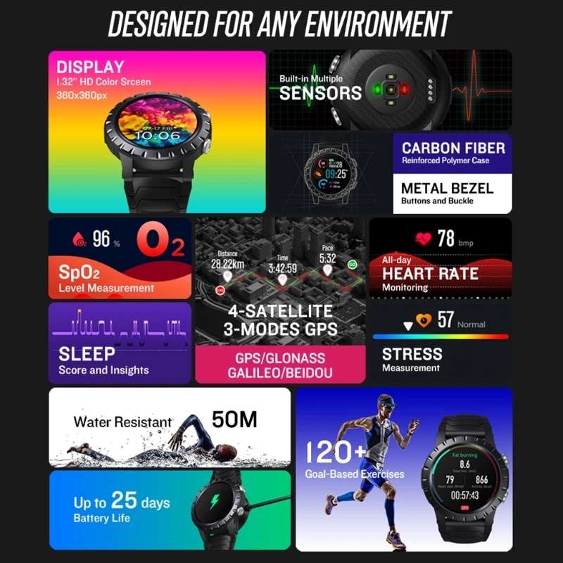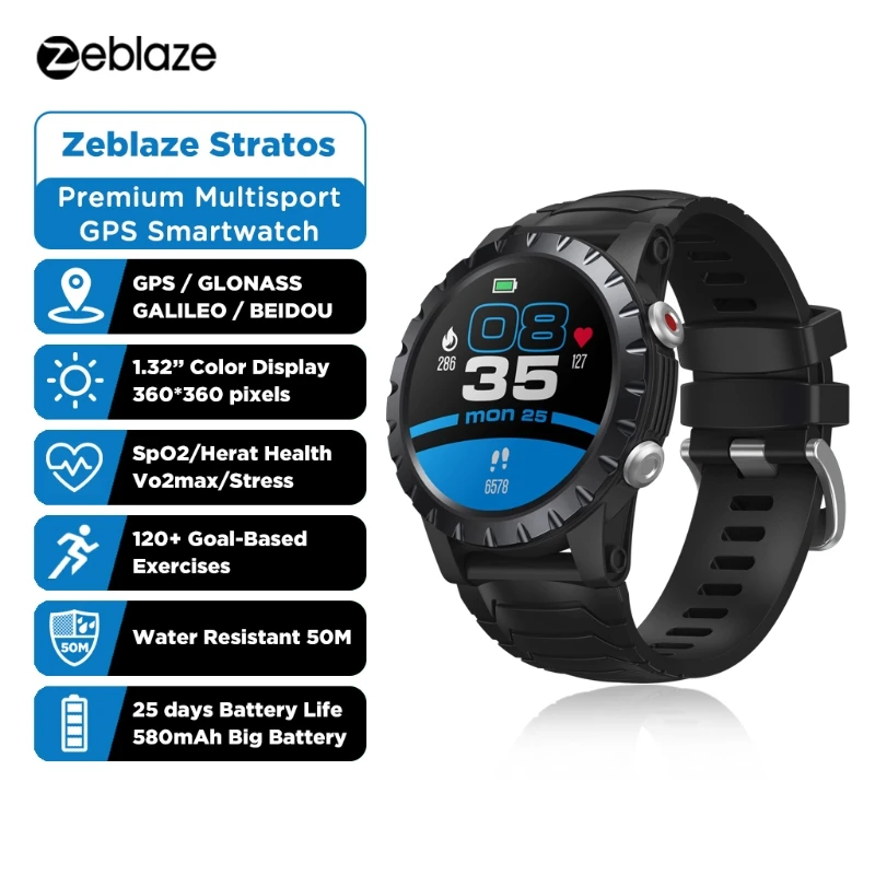 Новинка 2021 спортивные Смарт-часы Zeblaze Stratos gps GPS GLONASS GALILEO пульсометр SpO2 VO2max антистресс 25 дней работы от батареи WR 5 ATM