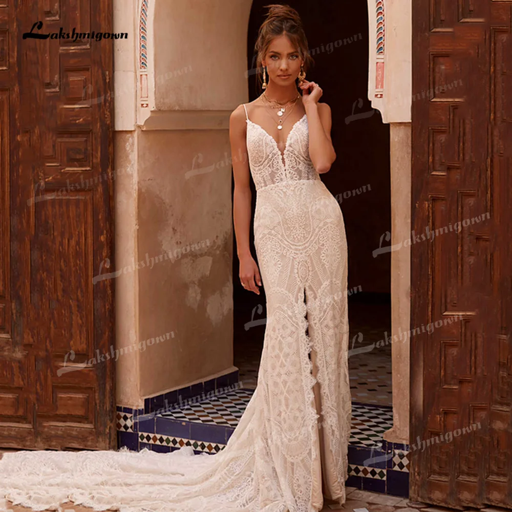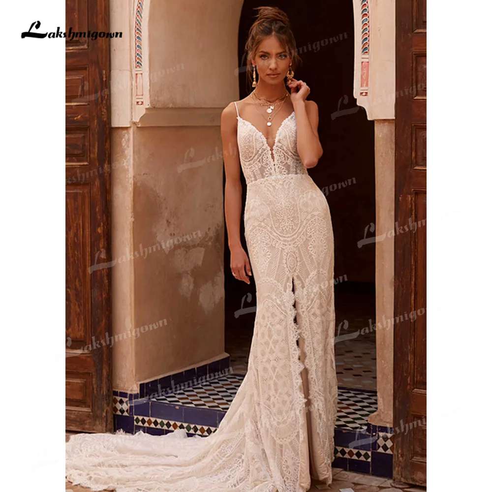 Очаровательное кружевное свадебное платье-футляр с V-образным вырезом без рукавов на бретельках с открытой спиной разрезом спереди со шлейфом пляжные платья для невесты