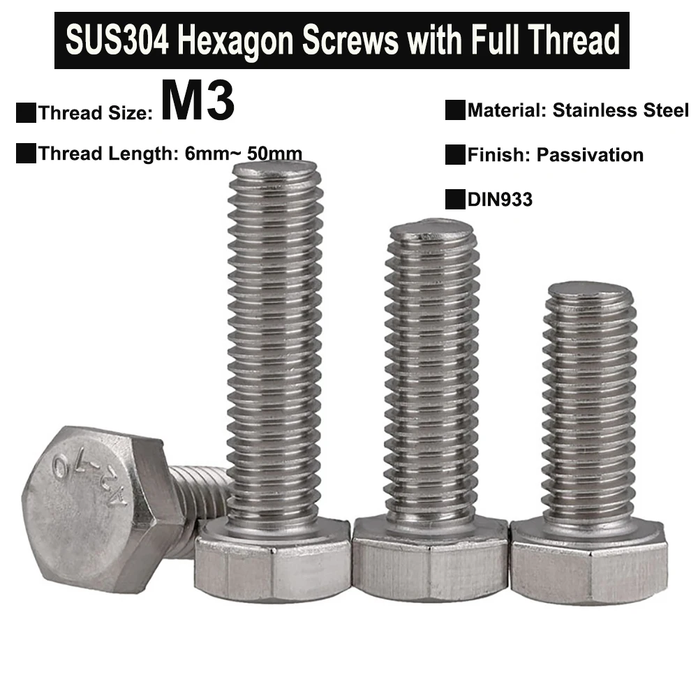 Винты с шестигранной головкой M3, SUS304, из нержавеющей стали, с очень длинной полной резьбой, DIN933, длина резьбы 6 мм 50 мм, 20 шт.10 шт.