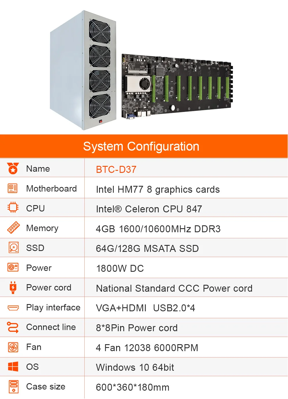 Цвет: черный + синийРазмер: 575x195 ммПамять: 1 * DDR3 Sodimm слот, поддержка 1066/1333/1600 МГцХранение: 1 * SATA3.0 + 1 * SATA2.0 + 1 * m SATA2.0USB: 4 * USB2.0Сетевой порт: гигабитный сетевой порт RJ45Расширяемый порт: 8 * PCIE 16X,8*6pin PCIE X16 разъем питания, HDMI-совместимый + VGA