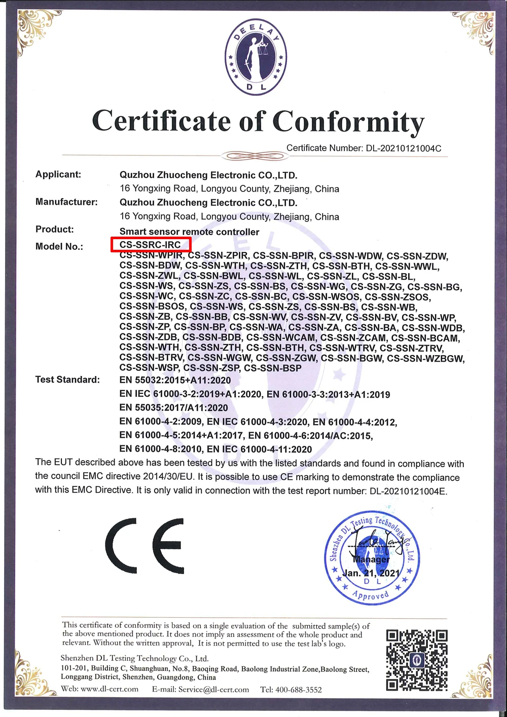 CS-SSRC-SRC умный пульт дистанционного управления был проверен CE/FCC/RoHS, CE сертификат номер: DL-20210121004C. Если вам нужен отчет о тестировании CE/FCC/RoHS, декларации о соответствии технических описаний или другой информации, пожалуйста, свяжитесь с нами.