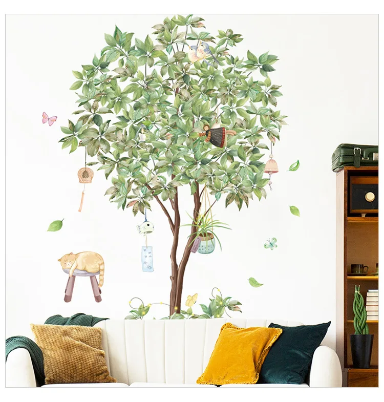 Наклейка Chuanhao с зелеными деревьями, ветром, колокольчиками, кошкой, наклейка на фон, наклейка для телевизора, наклейка на стену в спальню, Настенная Наклейка в пасторальном стиле