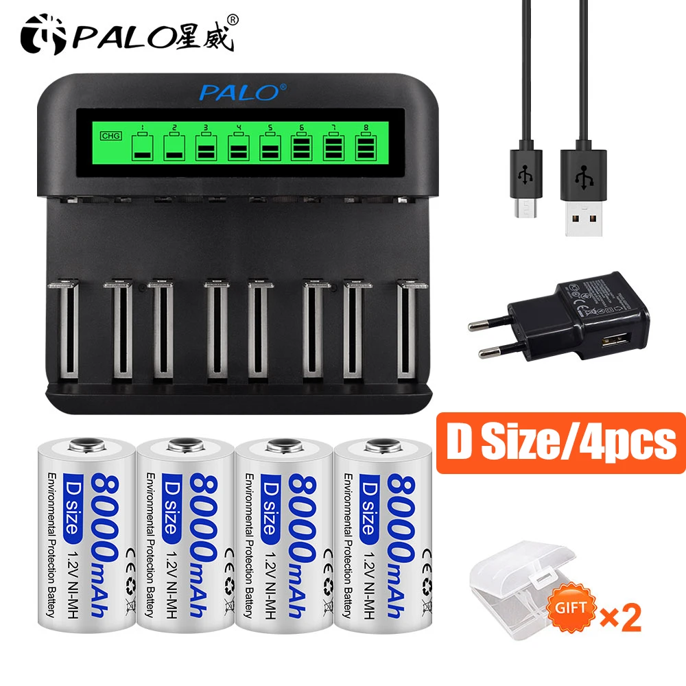 Аккумуляторные батареи PALO D, 8000 мАч, R20, 1,2 в, nimh D, тип D, для водонагревателя, зарядное устройство с ЖК-дисплеем