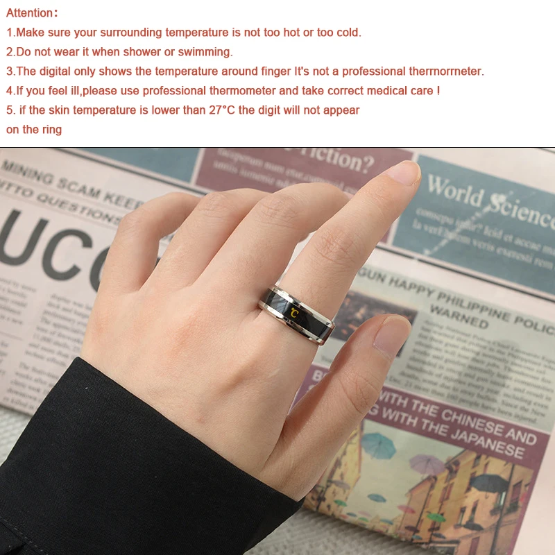 Внимание:1. Убедитесь, что температура окружающей среды не слишком жаркая или слишком холодная.2. Не носите его во время душа или плавания.3. Цифровой дисплей показывает только температуру вокруг пальца, это не профессиональный террноррнетер.4. Если вы чувствуете себя плохо, пожалуйста, используйте Профессиональный термометр и Позаботьтесь о правильной медицинской помощи!5. Если температура кожи ниже 27 °C, цифра не появитсяНа кольцеУбедитесь, что ваш палец согревается до нормальных условийЗимой температура низкая, Кольцо изготовлено из нержавеющей стали. Передача тепла медленная, и номер может отображаться очень медленно. ВЫ МОЖЕТЕ погрузить его в горячую воду, чтобы быстро отобразить номер. О фактической температуре: у меня есть 28 градусов, хотя температура тела составляет 36,6, и это естественно! T. К. Конструкция кольца использует стандартную тепловую ленту тепловых релизов, без какой-либо калибровки и внесения изменений в то, что кольцо внутри нагревается поверхностью кожи пальца (которая уже ниже температуры тела) И снаружи-рассеивает температуру в окружающей среде. Таким образом, кольцо не является активным носимым термометром в реальном времени, но брелок-это термометр, который должен быть погружен в измеренную среду. Вы хотите измерить температуру в помещении-снимите кольцо и оставьте на 10 минут, чтобы лежать. Вы хотите измерить температуру тела-поместите подмышку в течение 2-3 минут, вы можете измерить температуру воды в детской ванне (быстро реагирует, через несколько секунд). Таким образом, почти грубый термометр, который всегда под рукой) Используйте правильно.-когда вы носите кольцо на пальце в течение 20-30 секунд, он автоматически отображает керамику с температурой.
