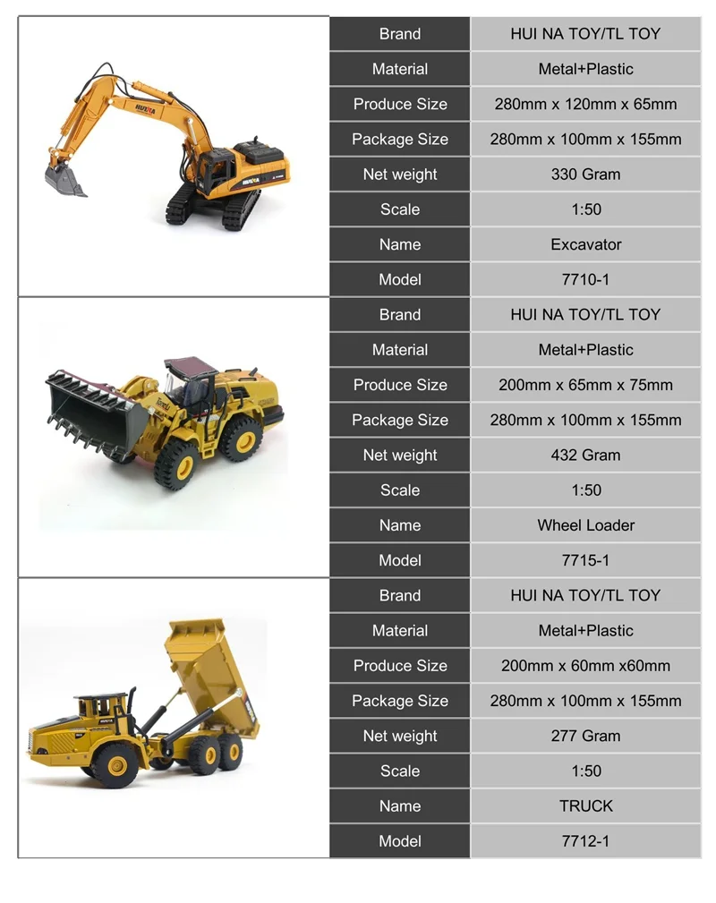 Самосвал HUINA 1:50, экскаватор, колесный погрузчик, Литые металлические модели, строительные машины, игрушки для мальчиков, подарок на Рождество, день рождения, автомобиль