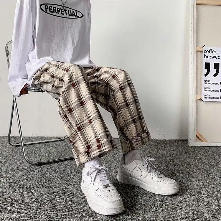 Брюки мужские клетчатые в Корейском стиле, повседневные клетчатые штаны, уличная мода, брюки с широкими штанинами в стиле Харадзюку, на лето