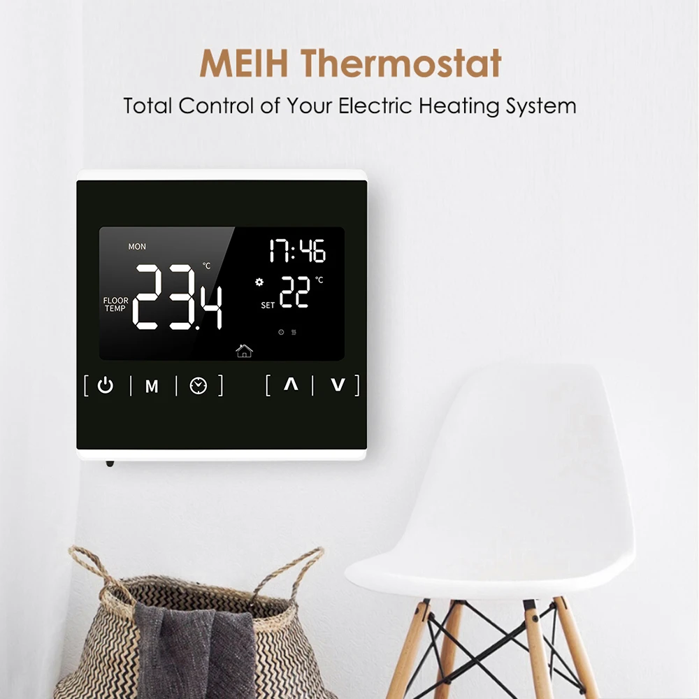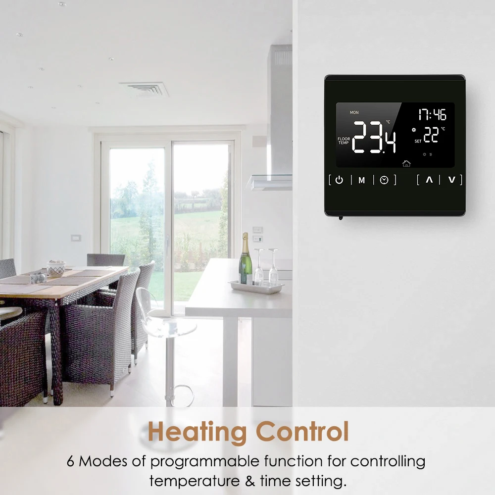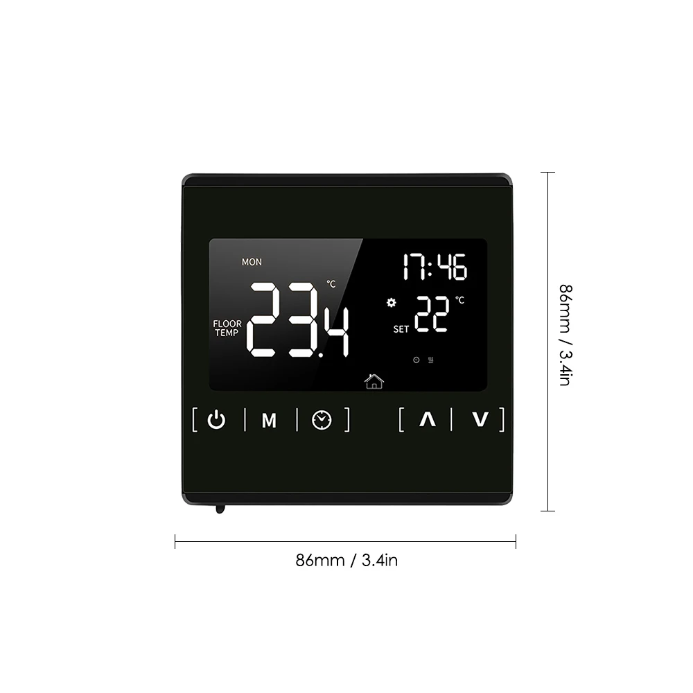 Этот цифровой термостат для напольного отопления использует передовое микрокомпьютерное управление чипом и высокоточный датчик для контроля температуры электрических нагревательных устройств. Управляйте моторизованным шаровым клапаном, моторизованным клапаном, тепловым клапаном, электромагнитным клапаном, нагревателем, электрической нагревательной пленкой и электронагревательным углеродным кристаллом. В основном используется для напольного отопления.Особенности:Термостат с подогревом сенсорного экрана, прост в установке и использовании и удобно сочетается с вашим стилем жизни.Программируйте его на основе вашего графика, чтобы сократить ваши счета за электричество. Гибкие программируемые сроки: 5-2 дня или 6-1 день.В состоянии выключения, функция анти-замерзания при низкой температуре будет автоматически включаться, когда он будет ниже 5 ℃; И защита от перегрева начнется, когда он будет более 7 ℃ для защиты пола.Ручной режим и программируемый режим можно выбрать с 3 метровым внешним датчиком.6 режимов программируемой функции для контроля температуры и времени. Доступны часы и минуты.Функция блокировки клавиатуры для предотвращения неправильного использования детьми.Функция памяти при отключении питания Защитите настройки от сбоя питания.Характеристики:Цвет: черный/белый (по желанию)Материал: Огнестойкий поликарбонат + АБС-пластикВходная частота: 60 ГцВходное напряжение: 85-250 В переменного токаДатчик температуры: термометр NTCТочность контроля температуры: ± 1 ℃Потребляемая мощность: <1 ВтТок нагрузки: 16AКлюч: сенсорное управлениеНастройка температуры: от 5 до 50 ℃Диапазон измерения температуры: -9 ℃ ~ 99 ℃Дисплей: 71*40 мм ЖК-дисплейРасстояние между установленными отверстиями: 60 ммПодходящий Размер коробки: 86*86 ммРазмер изделия: прибл. 86*86*45 мм/3,4*3,4 * 1.77inВес изделия: прибл. 135g/4,8 ozРазмер посылка: прибл. 10,4*10*8 см/4,1*3,9*3,1 дюймаВес посылка: прибл. 277 г/9,8 унцийУпаковочный лист:1 * термостат для подогрева пола1*3 метра кабель внешнего датчика2 * крепежные винты1 * Руководство пользователя (на английском и русском языках)Примечание:Для установки термостата необходимо подготовить распределительную коробку на стене, подходящий размер 86*86 мм. И расстояние установки 60 мм.