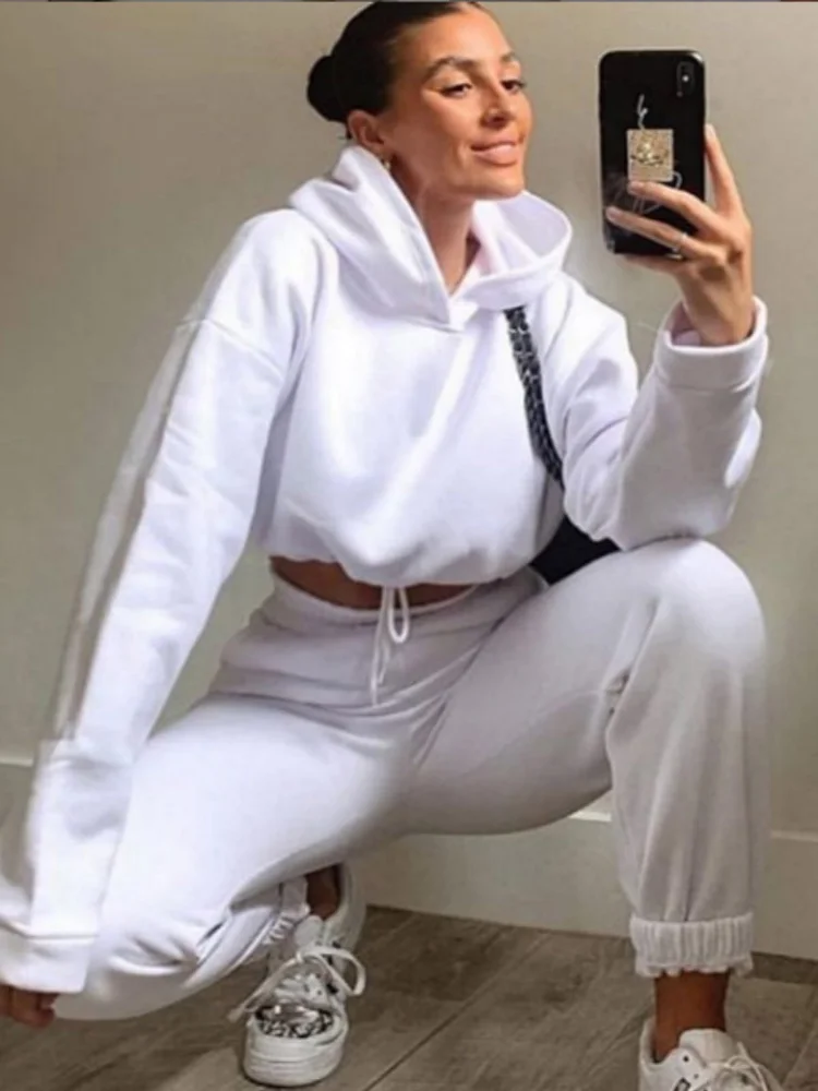 Autumn Winter Two Piece SetNeon Color Women Hoodie Fleece Sweatshirt Crop