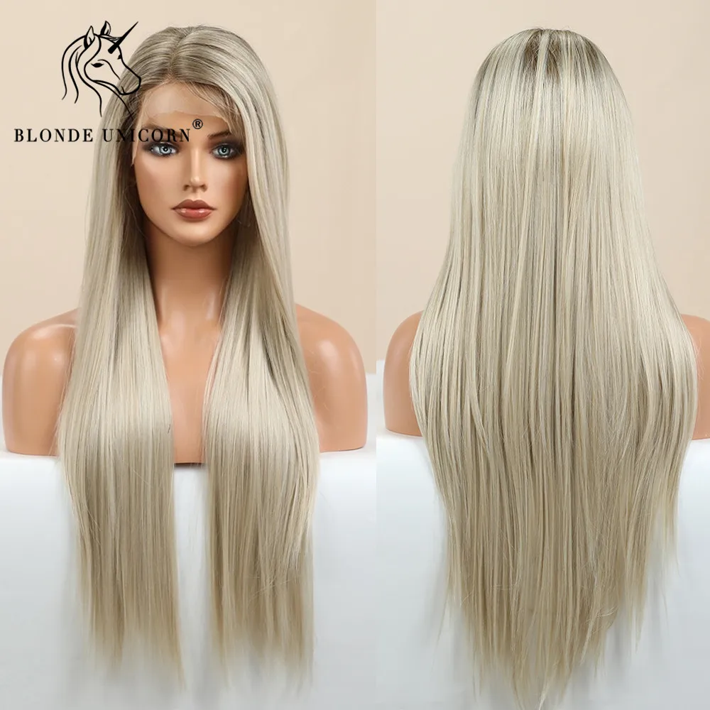 Блонд Единорог длинный Синтетический прямой Омбре светильник блонд Платина Кружева передние парики для женщин Косплей высокая плотность волос термостойкие
