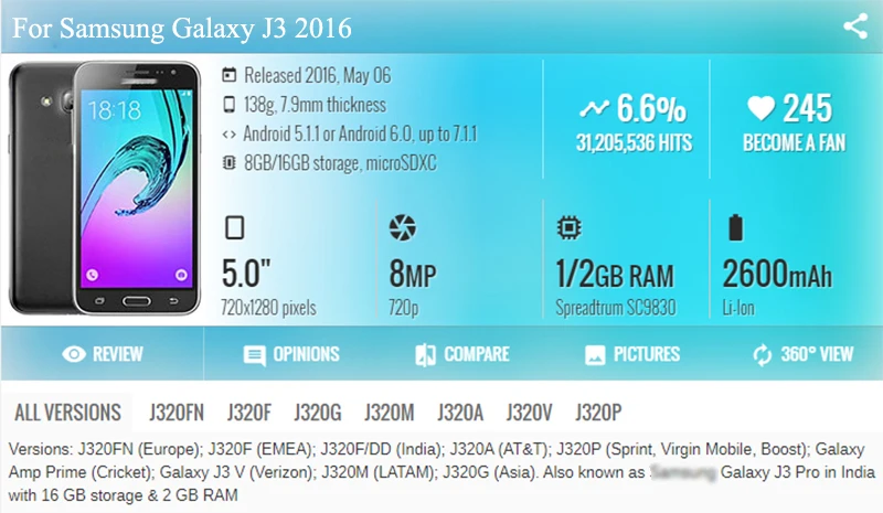 Номер моделиJ3 2016 J320FN J320F J320G J320M J320A J320V J320P