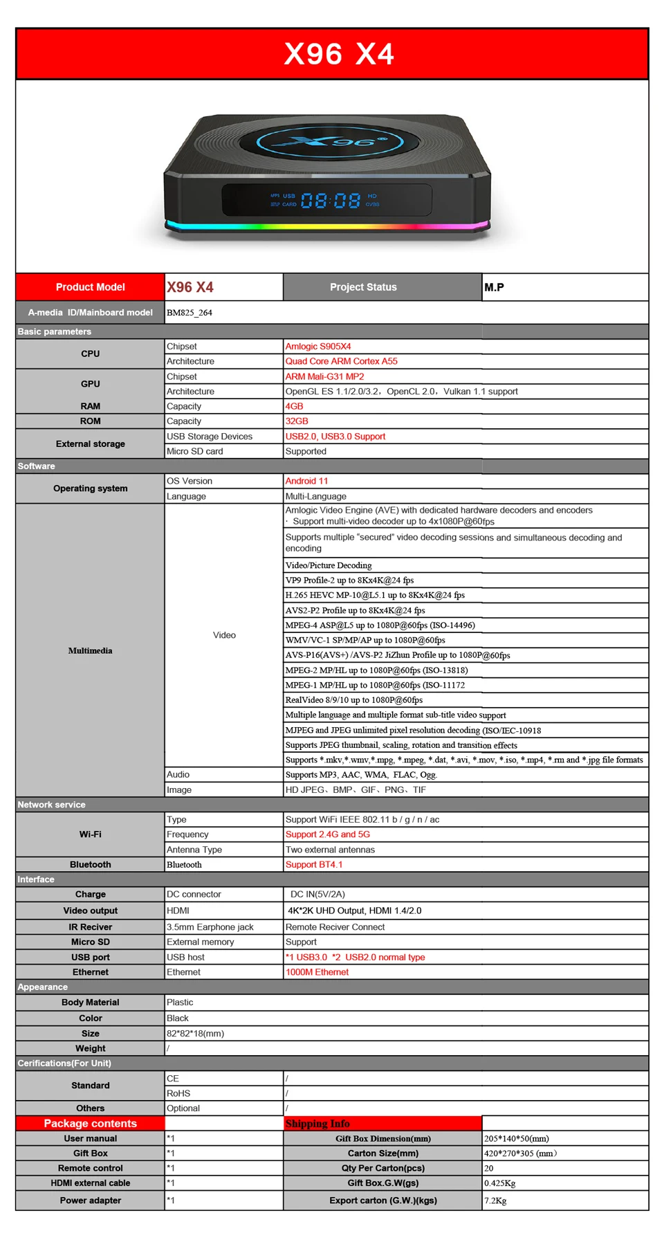 ТВ-приставка X96 X4, Android, 4 + 32464 ГБ, Amlogic S905X4