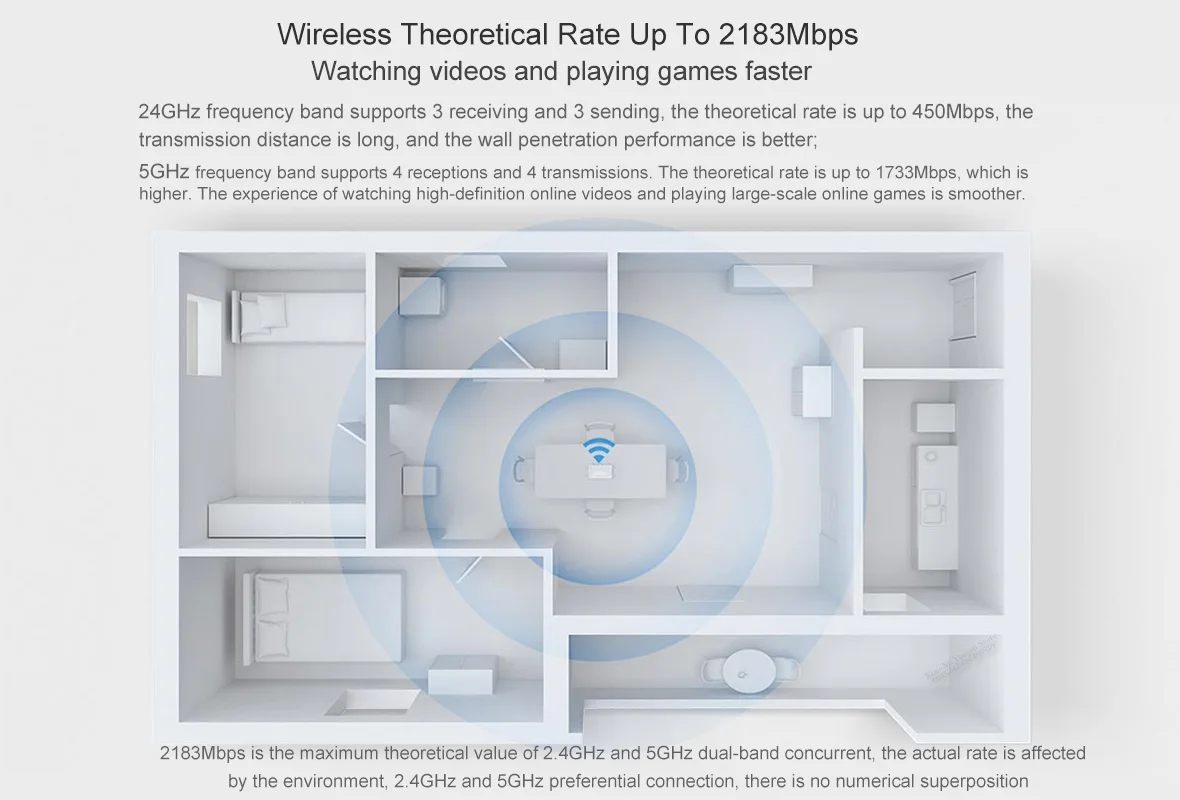 Это обеспечивает скорость Wi-Fi до 1733 Мбит/с на Wi-Fi 5 ГГц и 450 Мбит/с на 2,4 ГГц. Благодаря технологии beamforming и MU-MIMO, это делает общение более эффективным.