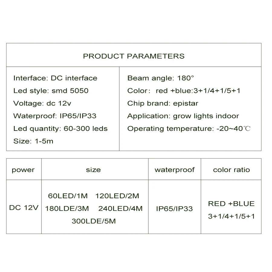 Характеристики:1. Цвет: красный и синий2. Степень защиты: IP65 Водонепроницаемый/IP33 не водонепроницаемый3. Рабочее напряжение: 12 В постоянного тока4. Количество светодиодный: 60 Светодиодный s / m5. Светодиодный тип ленты: 3 красных + 1 синий/4 красных + 1 синий/5 красных + 1 синий6.5050SMD: длительный срок службы, высокая яркость, энергосбережение7. Корпус: пыленепроницаемый водонепроницаемый термостойкий8. Сопротивление: защита цепи Особенности:1. Супер яркий 5050 SMD светодиодный, высокая интенсивность и надежность.2. Длительный срок службы 100000 часов3. Непрерывная длина, упакована в 1 м 2 м 3 м 4 м 5 м.4. Гибкая лента для изгиба изгибов5. Полностью гладкий и ровный светильник, решение неровной светящейся проблемы6. Ультра-яркий, но работает при низкой температуре7. Низкое энергопотребление, удобные, гуманистические и высокоэффективныеСпектральный диапазон влияния на физиологию растений:280 нм ~ 315 нм влияние на морфологические и физиологические процессы минимально315 нм ~ 420нм хлорофилл поглощает меньший эффект удара, предотвращает удлинение ствола420 нм ~ 500 нм (синий) хлорофилл и каротиноиды поглощают самую большую долю, самое большое влияние на фотосинтез500 нм ~ 620нм скорость поглощения красителя не высокая620нм ~ 750нм (красный) Скорость поглощения хлорофилла «Высокая», оказывает значительное влияние на фотосинтез и эффект фотохимидаСкорость поглощения 750нм ~ 1000нм, стимулирует удлинение клеток, воздействие цветения и прорастания семян> 1000 нм преобразуется в калории Применение:Идеально подходит для небольших коробок для выращивания, палаток для выращивания, Гидропоники DIY, бонсай, сада и т. д.