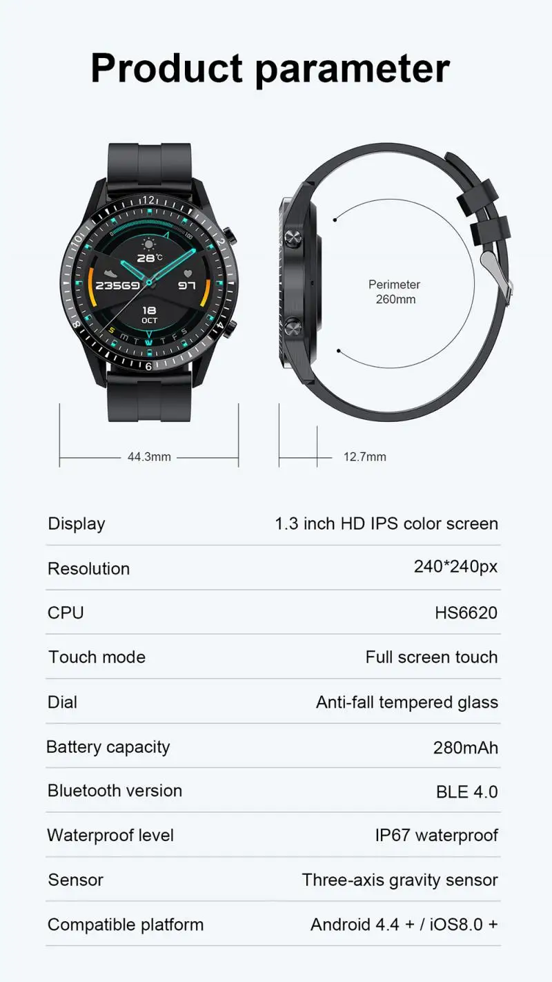 * Другие функции: напоминание о сидячем положении, напоминание о питьевой воде, будильник, удаленная камера, отсчет, Поиск телефона, поднятие запястья светильник экрана, переключение между несколькими циферблатами