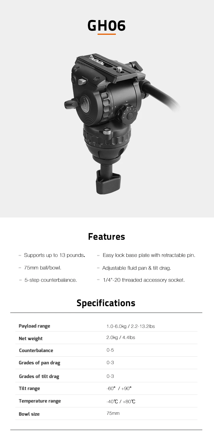 С тремя уровнями сопротивления жидкости и нулевой настройкой как на панораме, так и на наклоне, вы можете отрегулировать головку жидкости в соответствии с вашим стилем съемки или потребностями съемки.