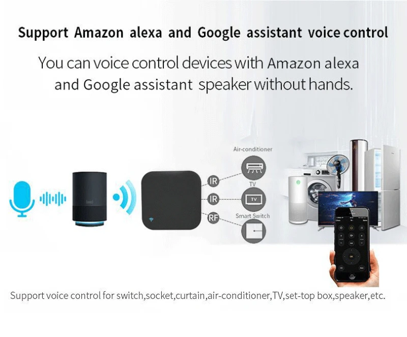 【Поддержка голосового управления 】совместимость с Alexa / Echo, Google Home, голосовое управление телевизором, телеприставка, кондиционер и вентилятор. Устройство поддерживает только 2,4G WiFi.