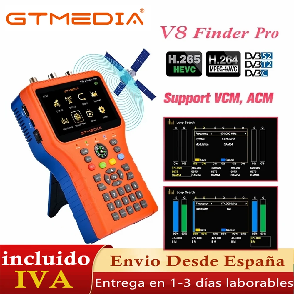 GTMEDIA V8 Finder Pro-это DVB-S2X/S2/S/T2/T/C и MPEG-2/4 H.264/H.265 (10 бит) совместимый ручной комбинированный счетчик, с его компактным размером, легким весом, интуитивно понятным пользовательским интерфейсом, длительным временем работы батареи и богатым набором функций, счетчик предоставляет все функции, необходимые для установки и проверки цифрового спутникового ТВ-сервиса, Антенный сигнал и кабельный сигнал для жилых домов или многожилых единиц.