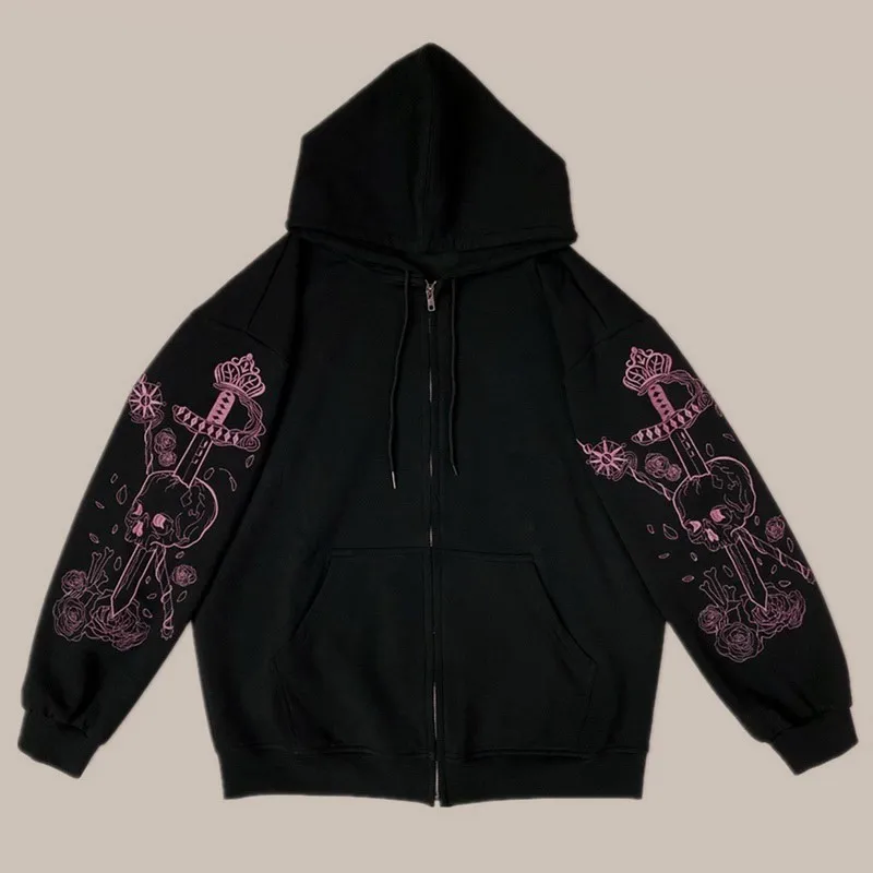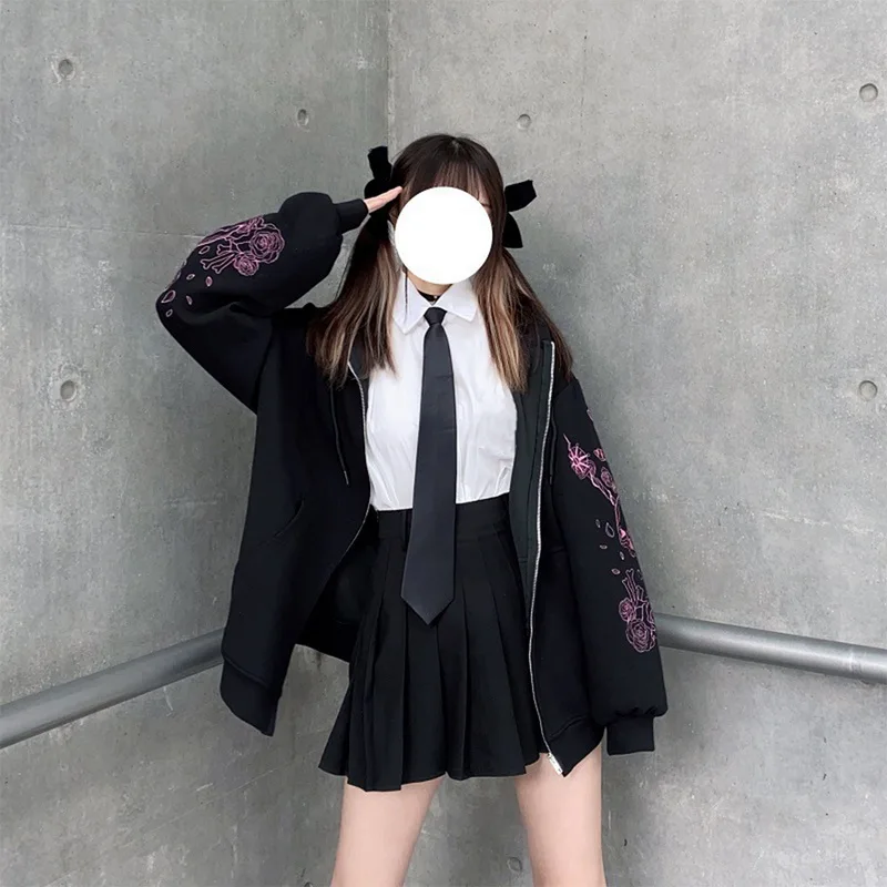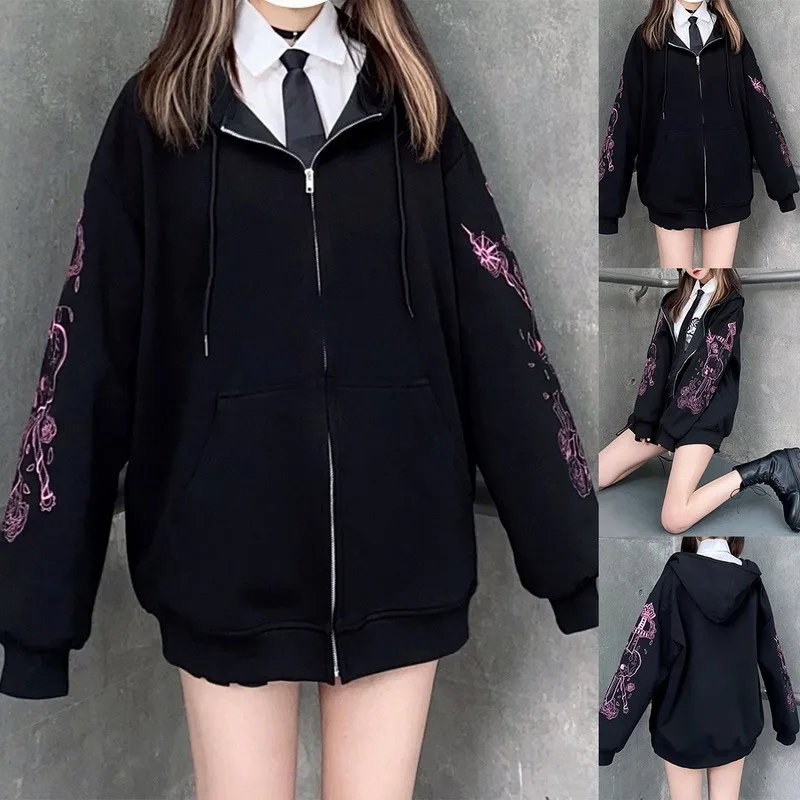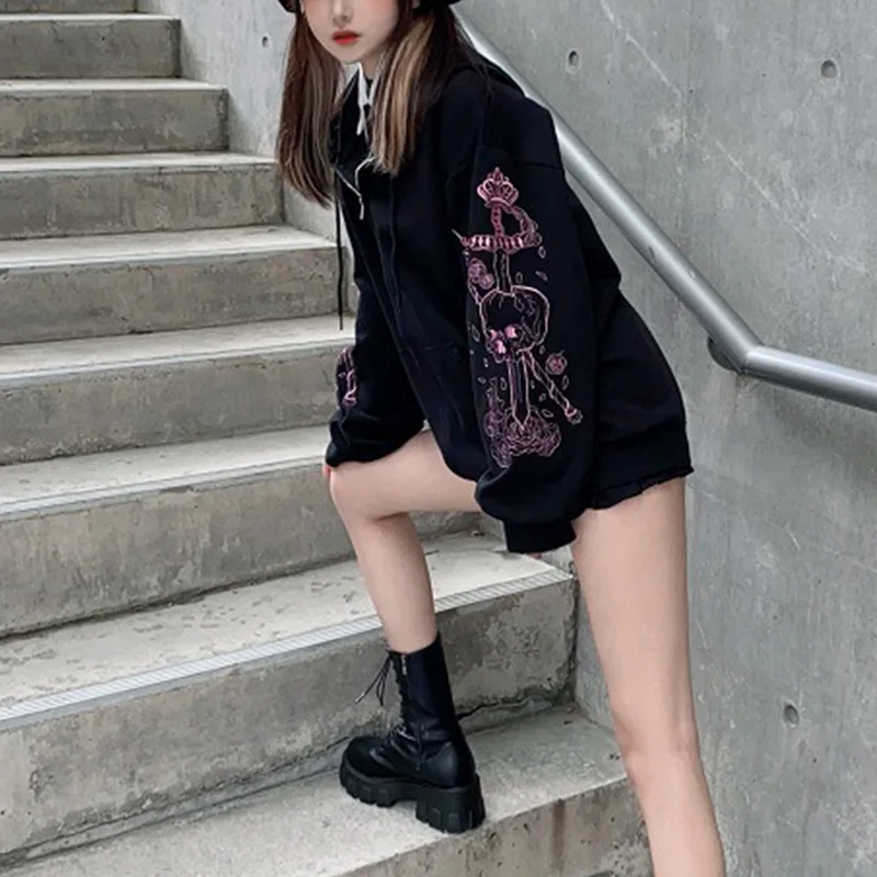 Куртка с капюшоном на молнии, винтажный Топ 90s, уличная одежда, панк, графический принт, лента, с капюшоном, винтажное черное пальто оверсайз, толстовка