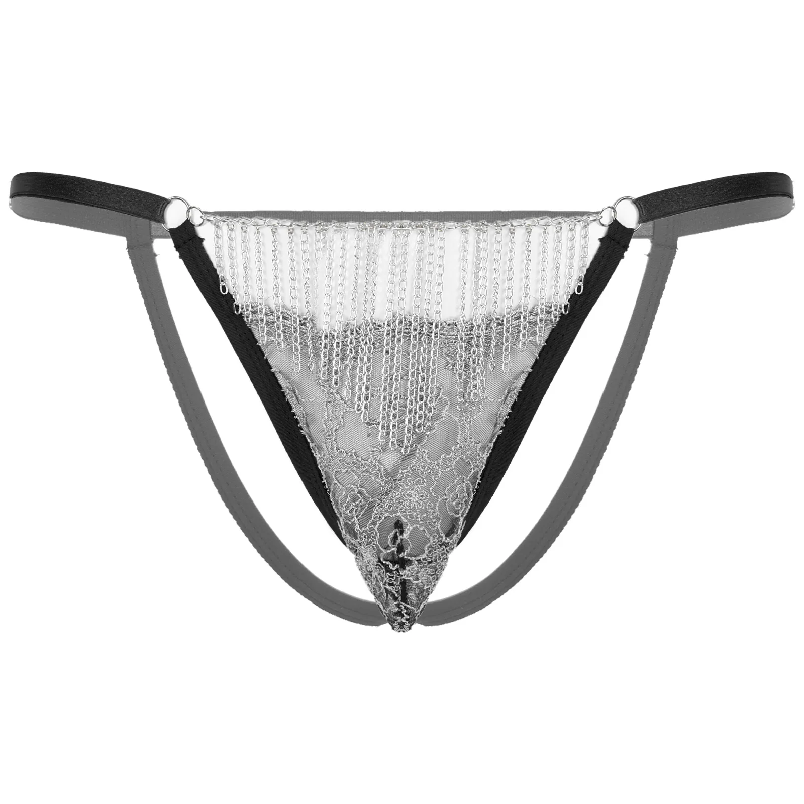 Трусы-стринги мужские с металлической цепочкой, пикантные кружевные трусы с кисточками, с низкой посадкой, эластичный пояс, с бахромой