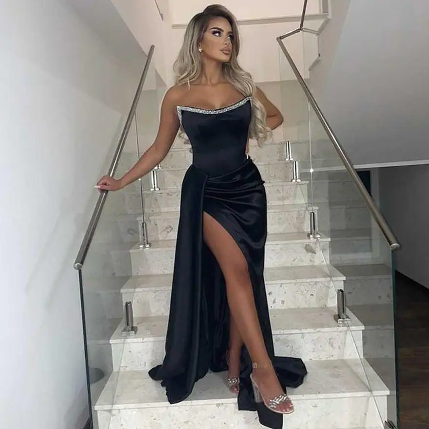 Черные Выпускные платья 2022 вышитое бисером без бретелек сексуальное длинное платье с Боковым Разрезом для невесты для особых случаев молния сзади Коктейльная вечеринка