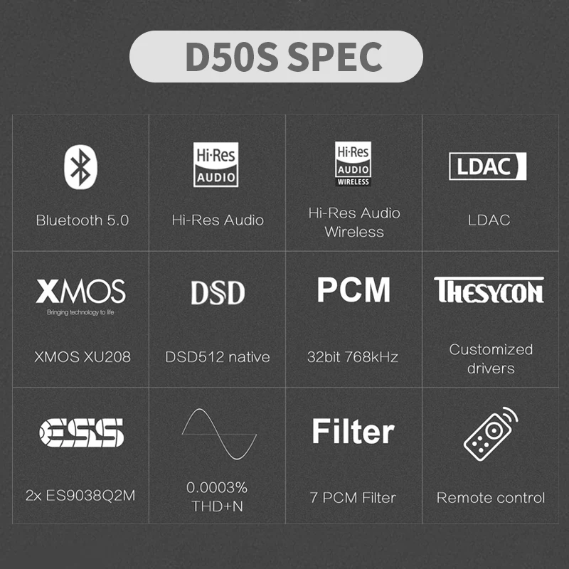 Характеристики устройства: Измерения: 11,9 см x 11 см x 2,6 см Вес: 510 г Вход питания: DC5V/1A Цвет: черный/серебристый Вход: USB/OPT/COAX/BT Линейный выход: RCA Параметры: D50s выход: DAC( LineOut COAX 96K вход) THD + N @ A-вес <0.0003% @ 1 кГц <0.0004% @ 10-20 кГц SNR @ A-Взвешивание> 122дб @ 1 кГц Частотная характеристика: 20 Гц-20 кГц (+ 0.1дб) Выходной уровень: 2Vrms OdBFS Шум:<2uVrms Перекрестный канал:-130 дБ @ 1 кГц Баланс канала: 0025 дБ