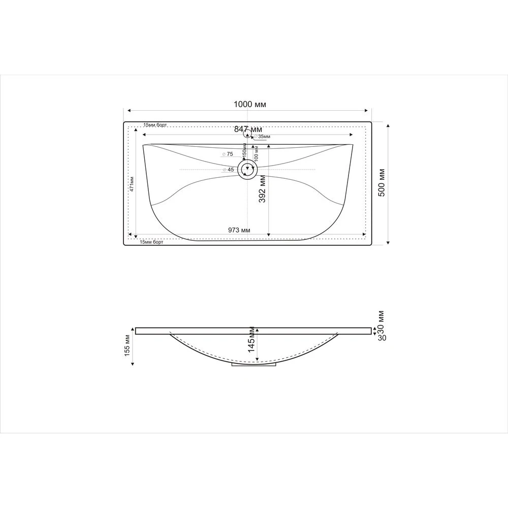 Изделие: раковина Ширина: 100 см Глубина: 50 см Высота: 15.5 см Подвесная установка: нет, не возможна Установка на мебель или столешницу: да, возможна Тип раковины: мебельная Установка на пьедестал или ножки: нет, не возможна Установка на полупьедестал: нет, не возможна Угловая конструкция: нет Перелив: нет Кол-во отверстий: с 1 отверстием Материал изделия: искусственный мрамор Число чаш: 1 чаша Крепление в комплекте: нет Форма: прямоугольная Стиль: современный стиль (Hi-Tech) Цвет: белый мес Страна происхождения бренда: Италия Рекомендуемый размер излива: средний, длинный Состав поставки: раковина, инструкция, гарантийный талон