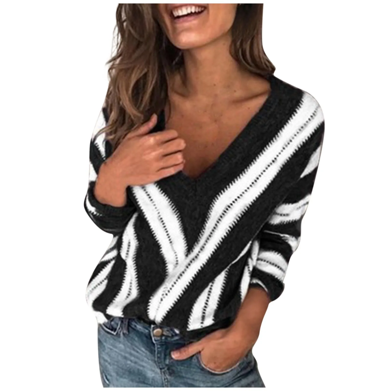 Модный осенний Свитер оверсайз винтажный вязаный свитер в полоску с V-образным вырезом повседневные осенне-зимние пуловеры трикотажный джемпер Топы