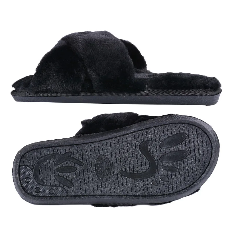 Тапочки женские меховые, на плоской подошве, с перекрестными ремешками