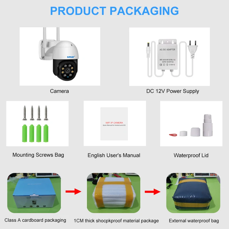 1X1080P Беспроводная PTZ ip-камера (TypeA и TypeB опционально)1 х адаптер питания DC12V (короче 1 метра)1 х Руководство пользователя1 х сумка для винтов(Карта Micro SD: Нет sd-карты/32 ГБ/64 Гб/128 Гб опционально)