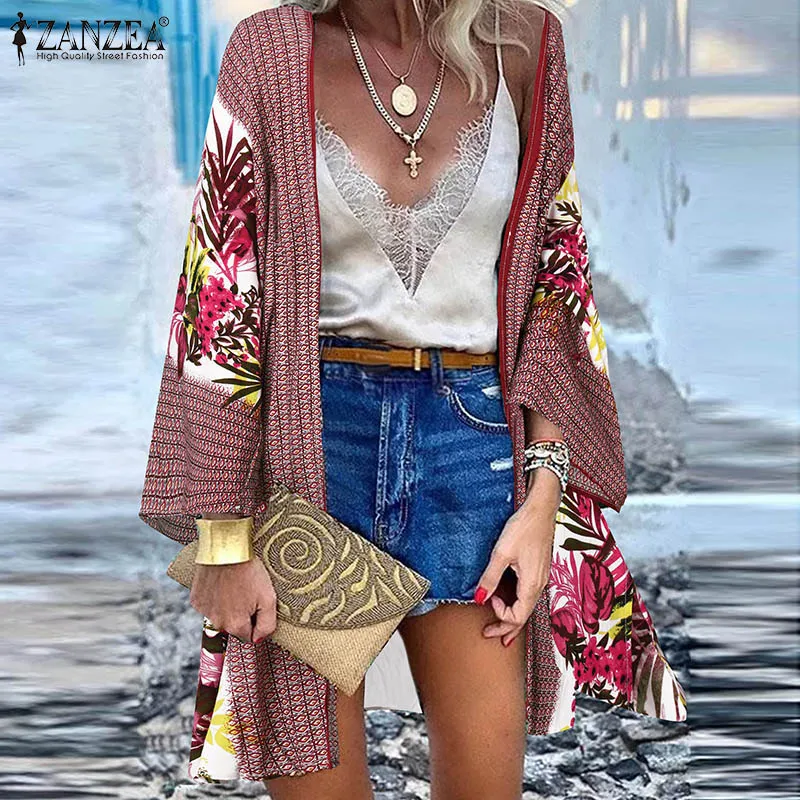 Повседневное кимоно с расклешенными рукавами, Женский богемный кардиган, осенняя накидка ZANZEA с цветочным принтом, Длинная блузка, праздничные этнические майки