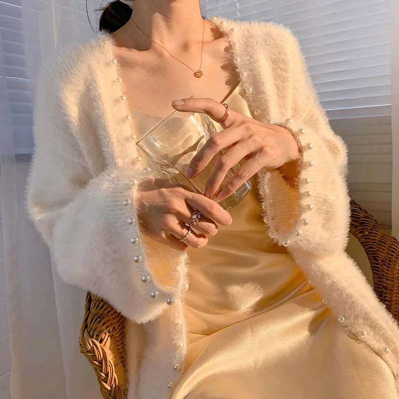 Женский свитер с бусинами и жемчужинами, кардиганы, длинное вязаное мохеровое пальто, осенняя Женская свободная норковая кашемировая куртка, пушистые топы, женский свитер