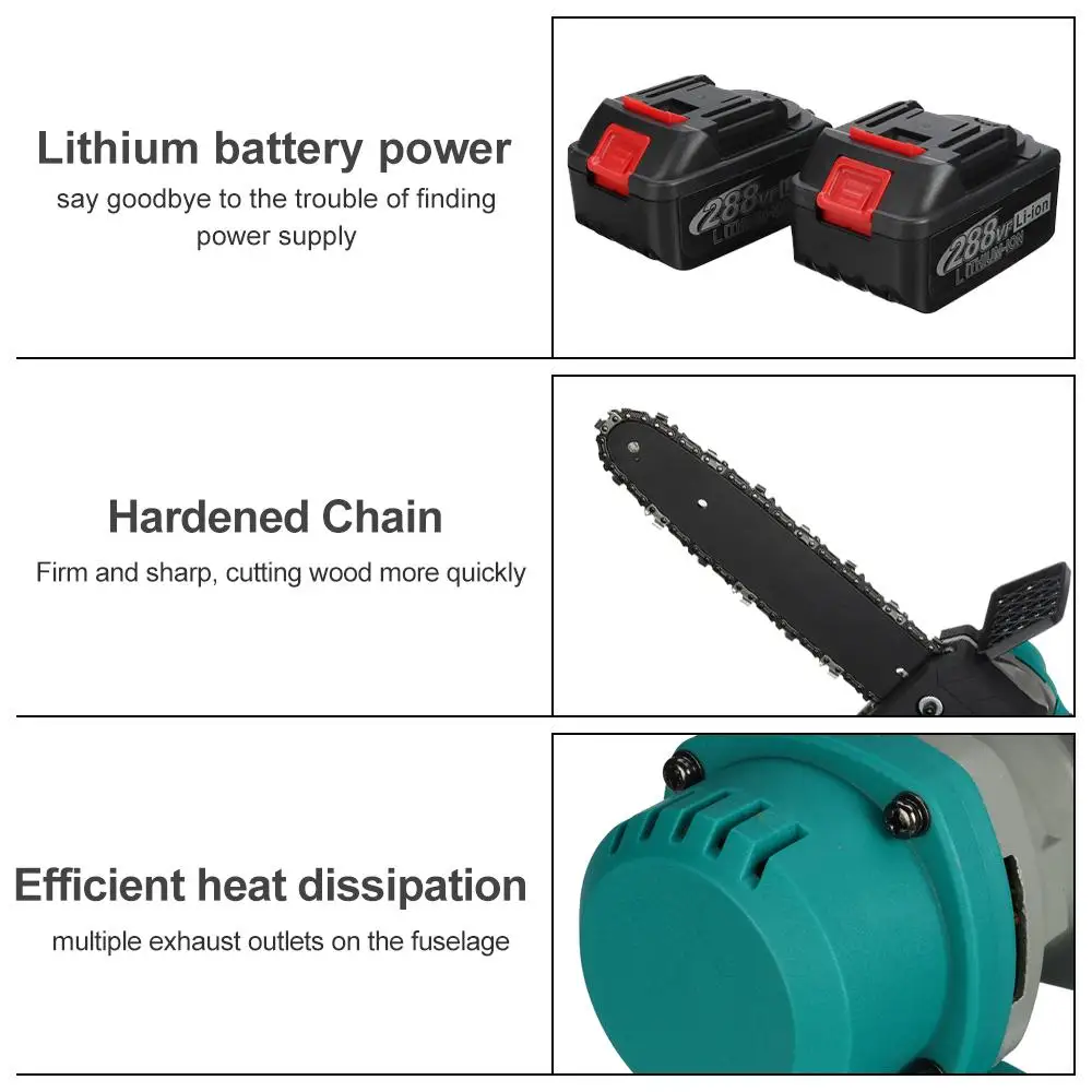 Характеристики:Тип: электрическая пилаЦвет: синийМатериал цепи: Высокоуглеродистая стальСкорость вращения: 10000р/минРазмер цепи: 8 дюймов/10 дюймовАккумулятор: 288VF 22900mahМощность: 2500 Вт