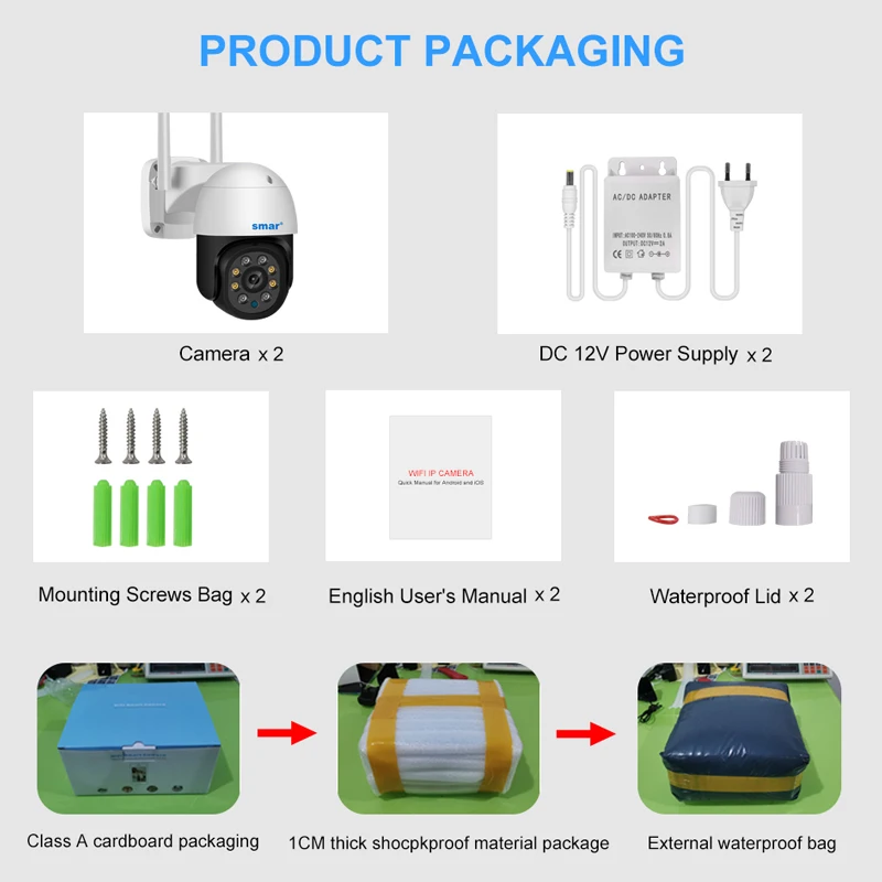 2X1080P Беспроводная PTZ ip-камера (TypeA и TypeB опционально)2 X адаптер питания DC12V (короче 1 метра)2 X Руководство пользователя2 сумки с винтами(Карта Micro SD: Нет sd-карты/32 ГБ/64 Гб/128 Гб опционально)